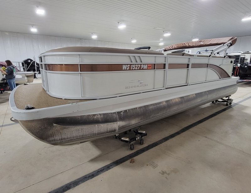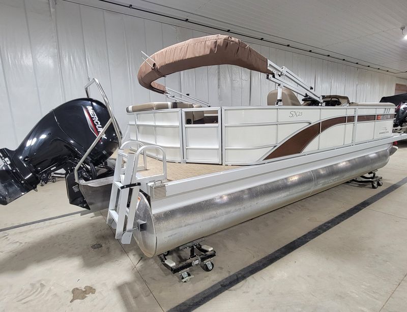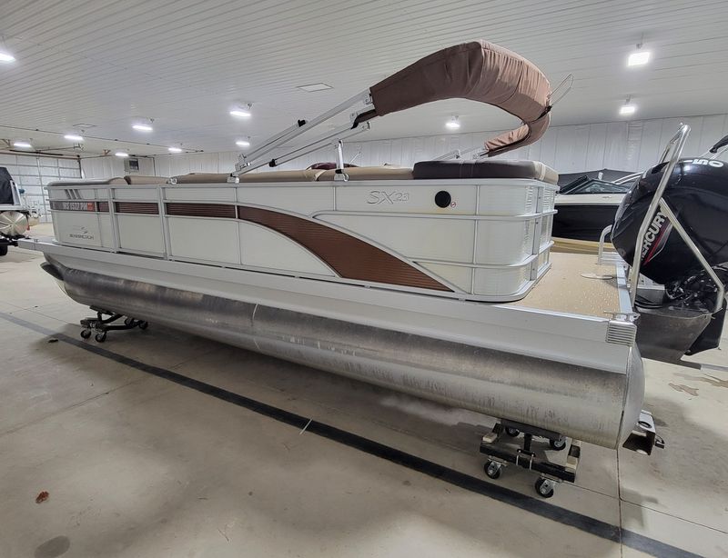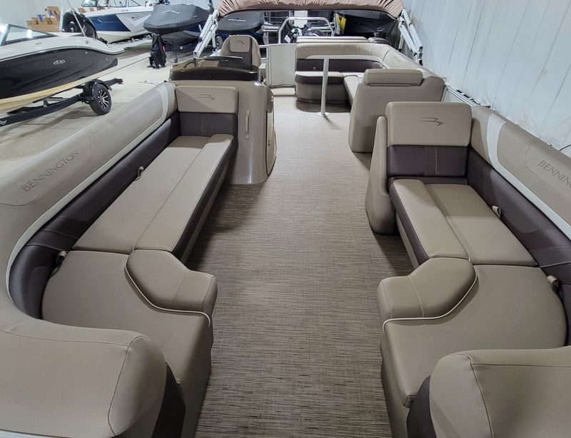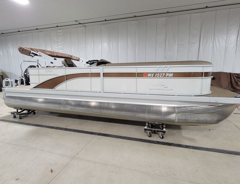 2023 Bennington 23 RSR – This 23′ tritoon is powered by a 250hp Yamaha VMAX SHO, delivering powerful, efficient performance for cruising, watersports, or relaxing days on the lake. The ESP Performance Package provides excellent handling and stability, while the curved power bimini top with LED lighting and bamboo silver vinyl flooring create a comfortable, stylish atmosphere. The helm features a Simrad Go12 display, RGB toe-kick and cupholder lighting, stainless Corvina wheel, and elevated console chaise for premium control and visibility. Additional highlights include Kicker sub and amp upgrade, in-floor storage, ski pylon, dual battery switch, and blackout Luxe package with Smooth Midnight Black panels and Graphite Simtex interior. Finished with pillowtop diamond-stitched upholstery and Rosa Red embroidery accents, this 23 RSR blends performance, luxury, and craftsmanship. Call or visit us today to make it yours!