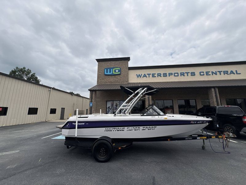 The 1996 Nautique Super Sport is a 21-foot (22'5" with platform) open-bow V-drive wakeboard boat, featuring a classic Ski Nautique-derived hull, seating for nine, and a PCM engine. It is renowned for creating a solid wake, having a 35-gallon fuel tank, and utilizing an integrated composite stringer system.