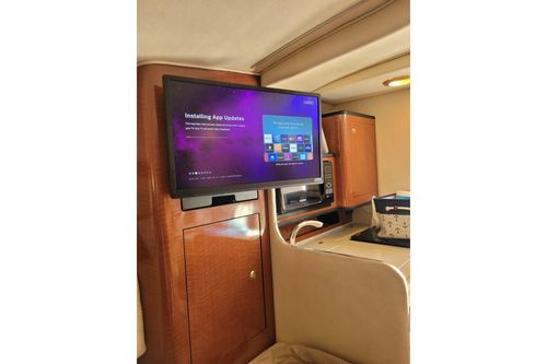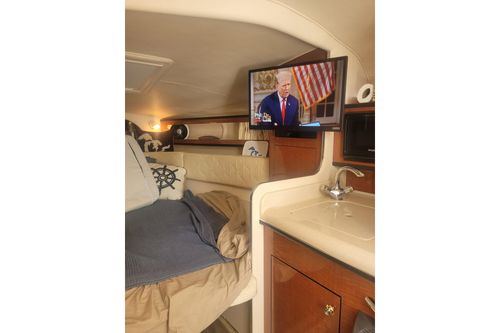 Inside, the cabin is well-appointed with a new stereo system and a mounted TV, creating a comfortable space for overnighting or weekend cruising. The engines have been recently tuned and serviced, reflecting consistent care and attention to maintenance.