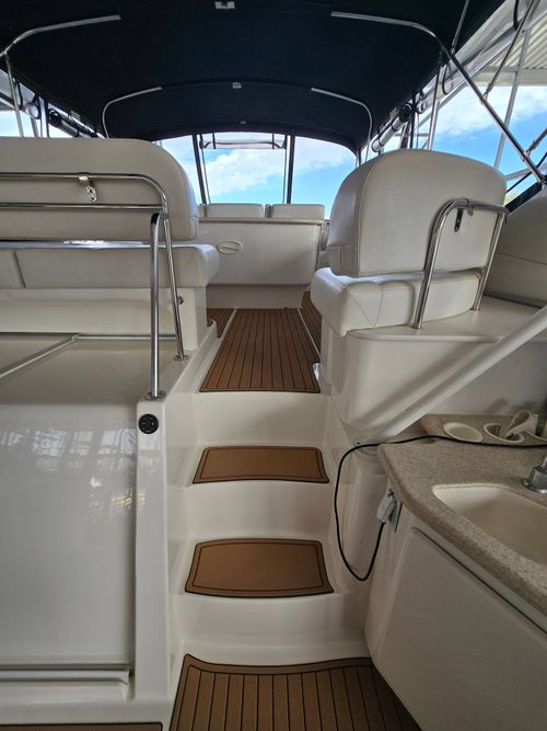 This yacht stands out for its range of enhanced features including state-of-the-art navigation system, excellent sound system, extensive storage space and a large swim platform perfect for water activities. The vessel also holds A/C units and a generator to ensure complete comfort at sea.