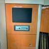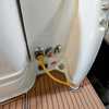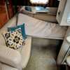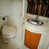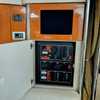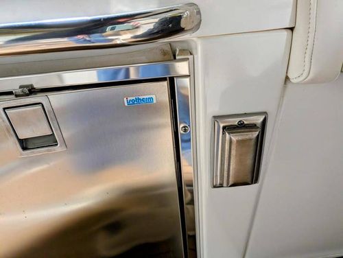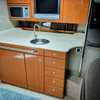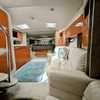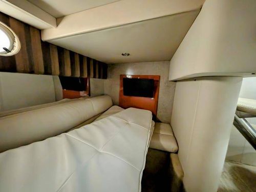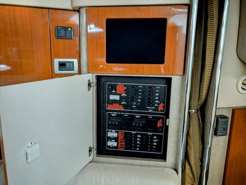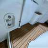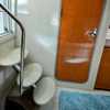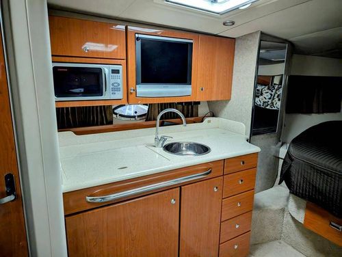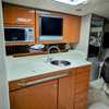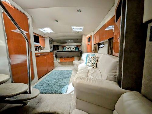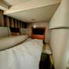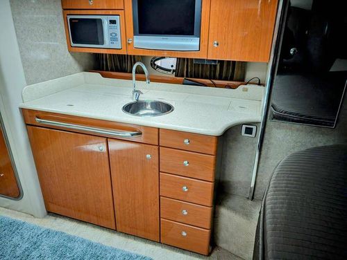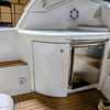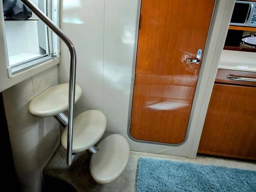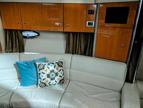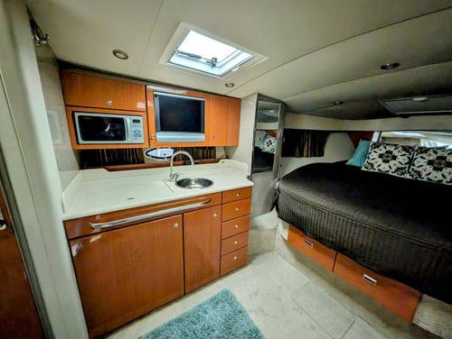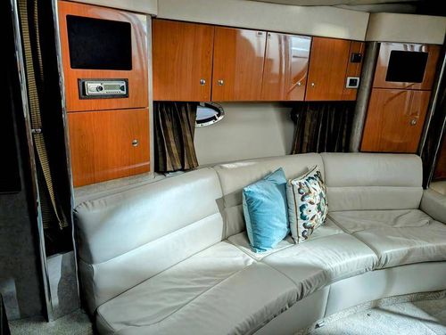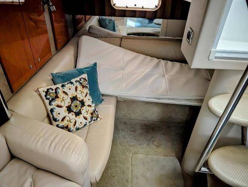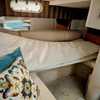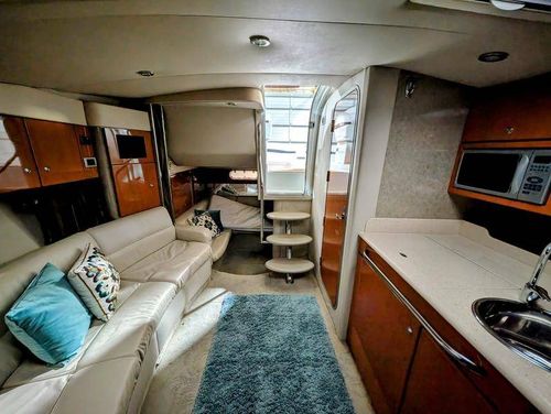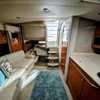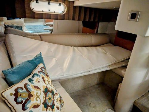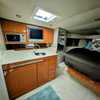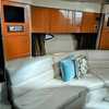 Step below deck to discover a cabin adorned with beautiful cherry cabinetry and Ultraleather upholstery. The spacious salon boasts a crescent-shaped sofa with a cherrywood table, a fully equipped galley with Cor&