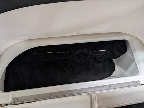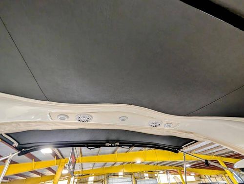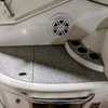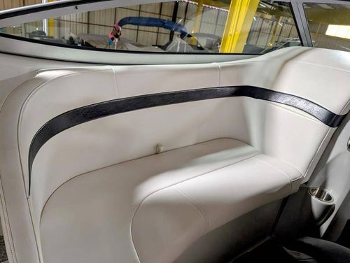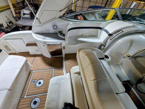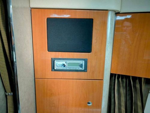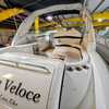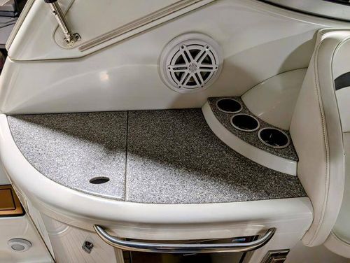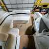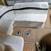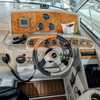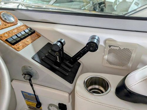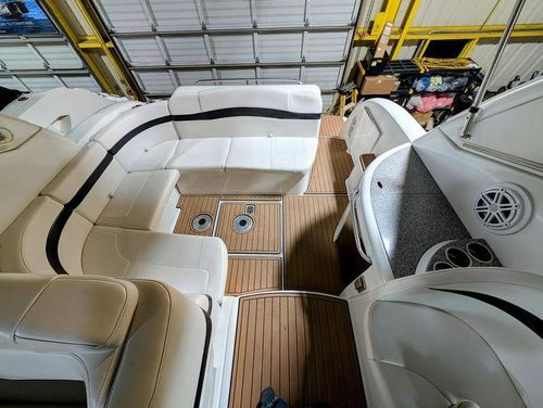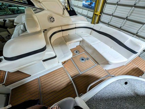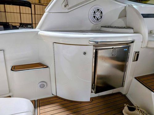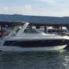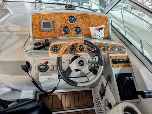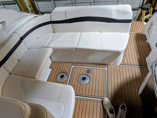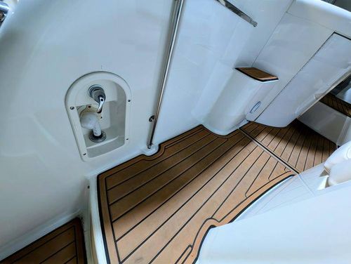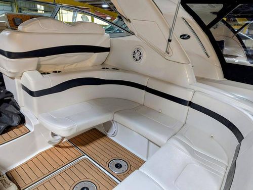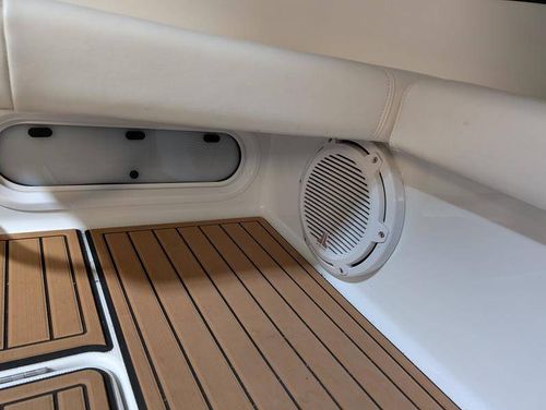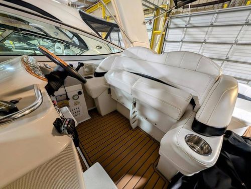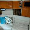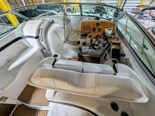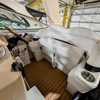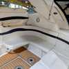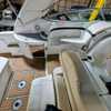 The cockpit is designed for both relaxation and entertainment, featuring a U-shaped lounge with tables that convert to a sun pad, a wet bar with a concealed sink, and ample seating for guests. The double helm seat with flip-up bolsters ensures comfort for the captain and co-pilot, while the integrated swim platform with a concealed ladder invites you to enjoy the water.