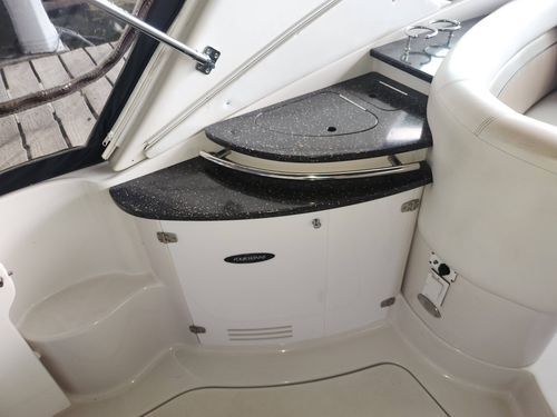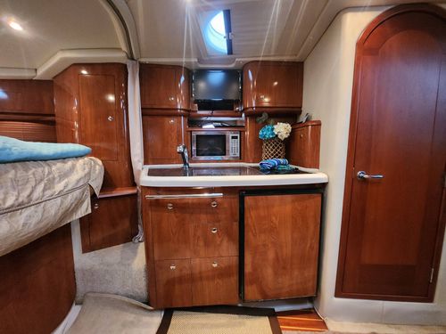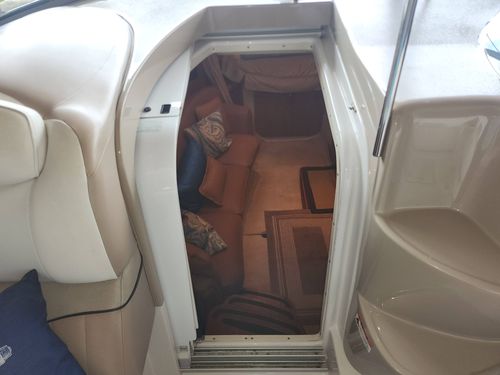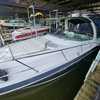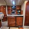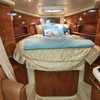 Designed for comfort, the cabin of this cruiser is spacious with deluxe amenities like a fully-furnished galley, comfortable sleeping quarters, and high-quality marine-grade upholstery. Wide windows provide ample natural light, accentuating the interior's elegance and providing breathtaking views of the surroundings.