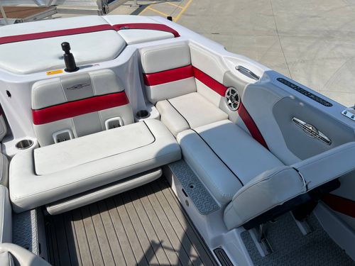 Enjoy smooth boating with the convenience of an integrated cruise control system. The boat also features a swivel board rack for easy storage and retrieval of boards.