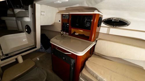 At 24 feet in length, the Sundancer 240 offers a spacious cockpit with ample seating, a convertible sun lounge, and a convenient wet bar—ideal for entertaining family and friends. The stylish cabin below features a V-berth dinette that converts to a comfortable sleeping area, a mid-cabin berth, a compact galley with microwave and refrigerator, and an enclosed head with sink and shower.