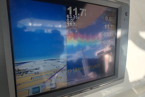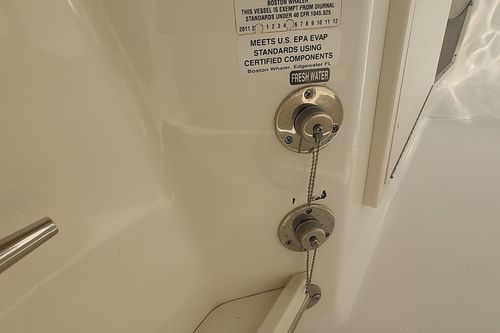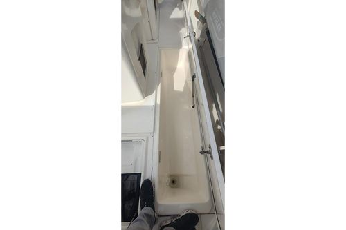 - Freshwater system with 28-gallon tank, sink at leaning post and transom shower