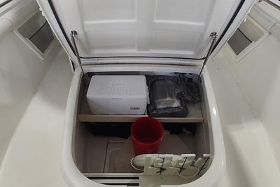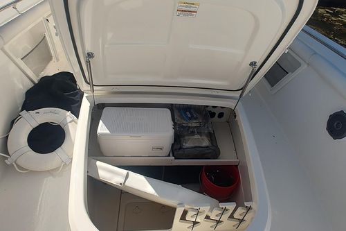 - Pressurized livewell (23 gal) in aft port corner with clear lid and blue interior with red and white LED lights