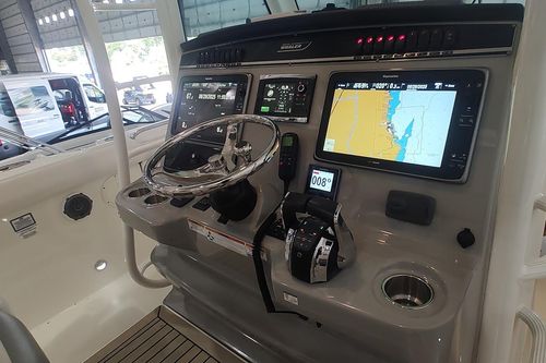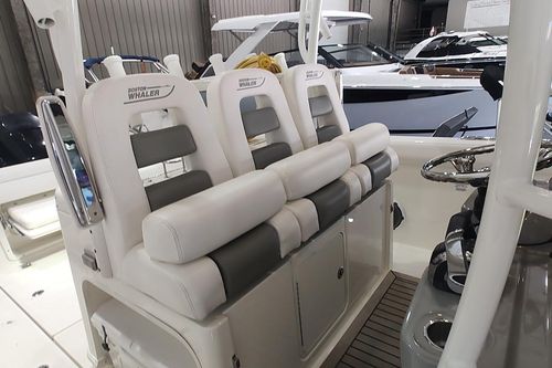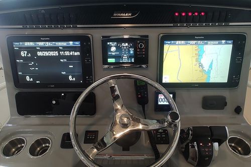 AccommodationsRemarkable capability marries beautifully with thoughtful amenities and cutting-edge technology in the Boston Whaler 350 Outrage. In the spacious cockpit, anglers will appreciate luxury fishing boat features including a deluxe leaning post/bait-prep center with 40-gallon livewell, tackle and tool storage, and freshwater sink with faucet. For entertaining, the optional Summer Kitchen makes hosting a breeze, thanks to an optional grill and fridge, sink and storage. Meanwhile, an optional upper station serves up spectacular views and phenomenal fishing functionality. From bow to stern, ample seating and storage ensure a comfortable ride and a smart, secure place for all your gear. Other premium features include a Sirius-ready Fusion stereo system, triple Mercury Verado FourStroke engines with optional Bow Thruster for effortless docking. On the 350 Outrage, every element combines to produce an exceptional experience.