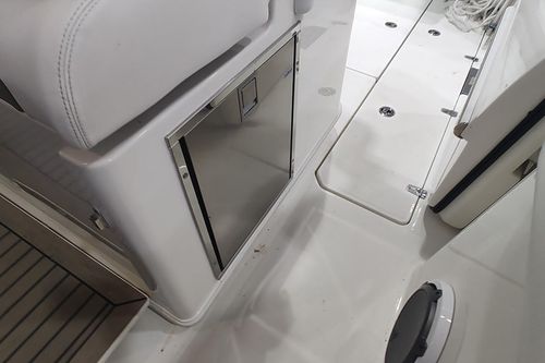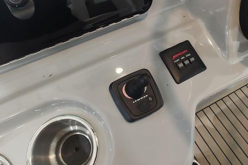 - Stainless steel drink holders – bow (2), hawse pipes (2), helm (3), leaning post (4), forward console lounge (2), bow seating area integrated into low bow rail (4)