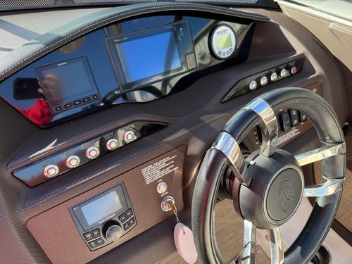 Equipped with a plethora of premium features, the White folding arch with navy bimini provides shade on sunny days, while the dual battery switch ensures uninterrupted fun. Keep your boat protected with the navy bow & cockpit cover, and illuminate your path with stainless steel docking lights. The driver's rearview mirror enhances safety, giving you a clear view of your surroundings.