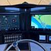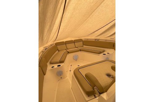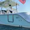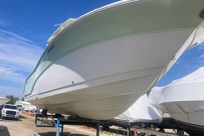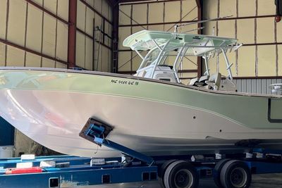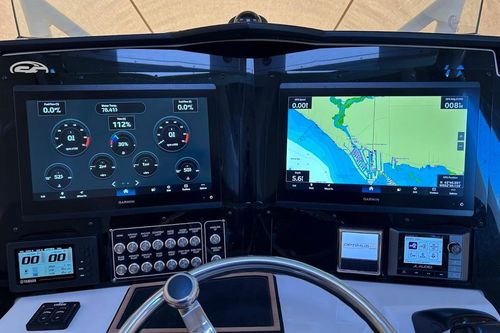 This vessel is powered by twin optional White 350hp Yamaha outboards which gives you a cruise speed of close to 40 MPH Designed with a significant Carolina Flare, it ensures a remarkably dry ride even in challenging conditions. The helm is outfitted with NEW twin 16" Garmin GPS/Chartplotters, Lenco trim tabs, and a flush-mounted windlass.