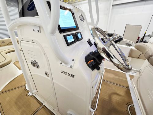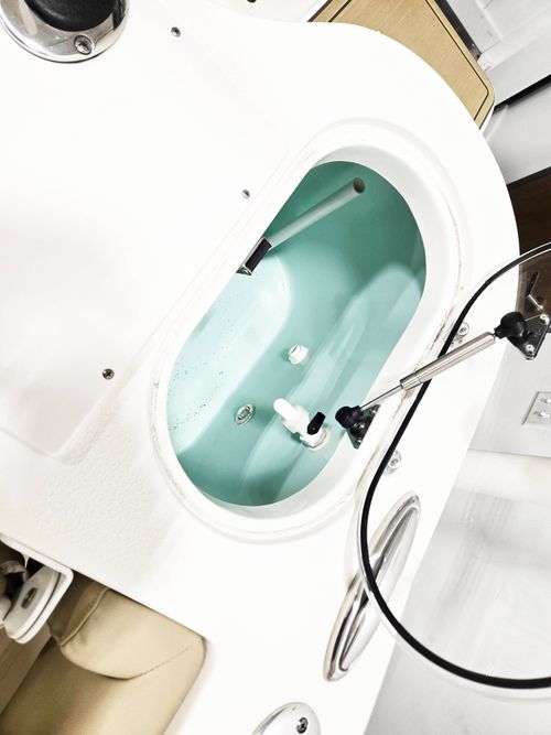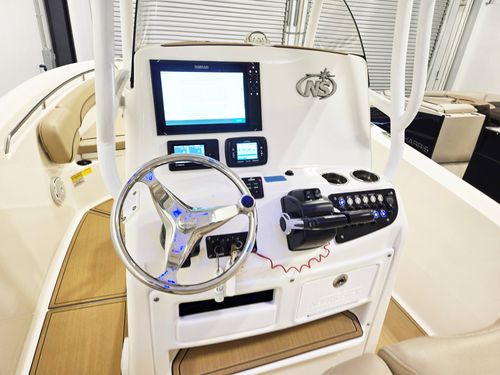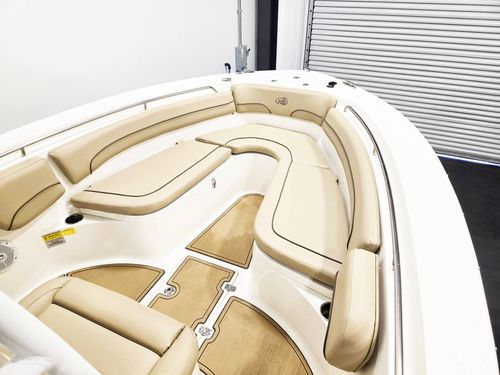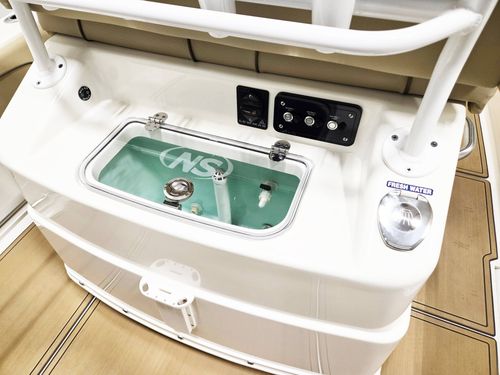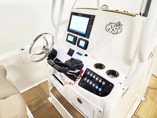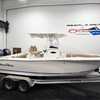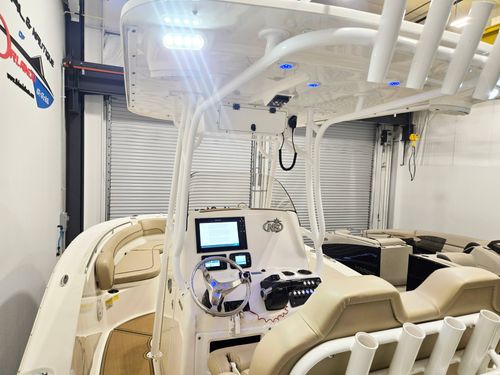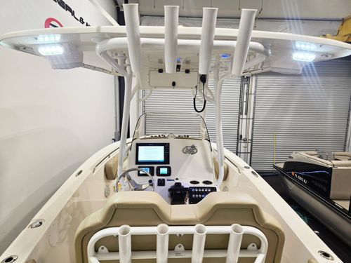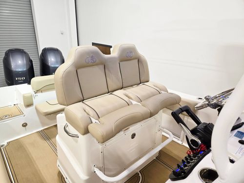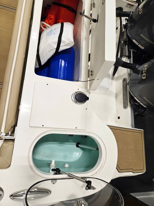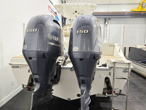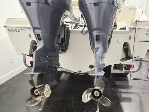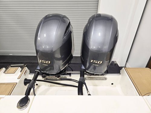 Twin Yamaha 150hp outboards, 9" SimRad, VHF radio, upgraded Infinity stereo system, Hardtop, two live wells, rear aft folding seat, rod holders, Stainless props, trim tabs, bow backrest and cushions, Head compartment with gravity flush head, Windlass anchor, dual battery switch, Full 4‑piece canvas cover and stand alone cockpit cover, Sea Dek throughout, stainless ladder, Dual‑axle Magic Tilt trailer.