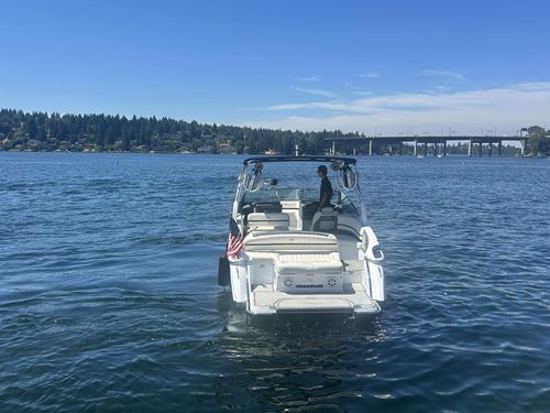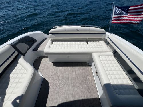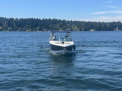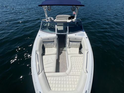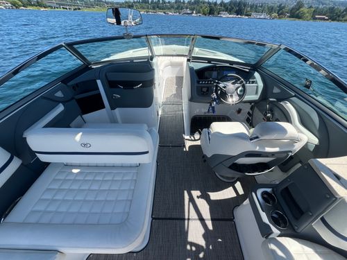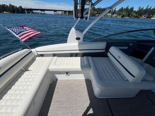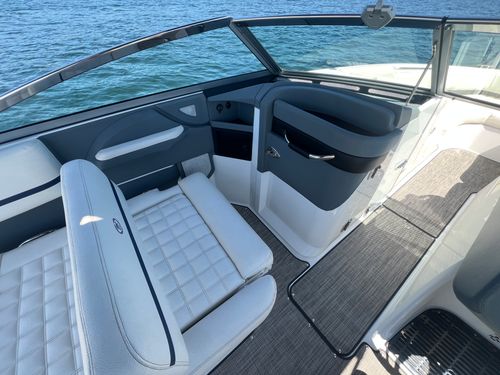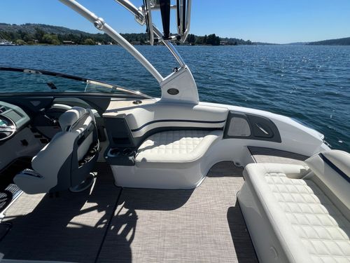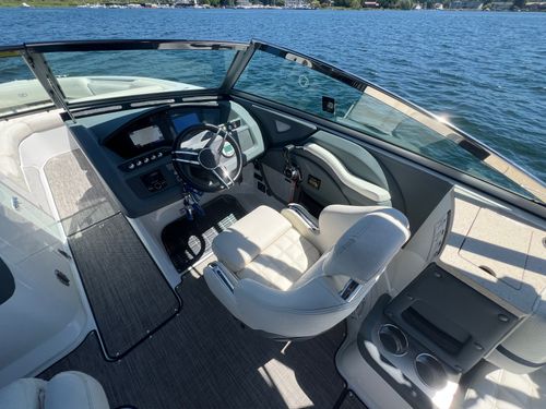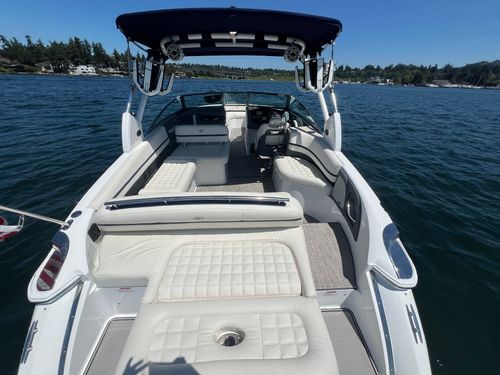 The 2019 Cobalt R7 Surf is a premium 27′6″ surf-bowrider designed for wake enthusiasts and families who demand both luxury and performance. Built on a 21° deadrise hull and powered by a Volvo Penta V8 sterndrive (380 hp), it delivers best-in-class ride comfort and responsive handling. The boat features a sophisticated hard-tank ballast system and cruise-control/Zero-Off settings for customizable, quality waves for surfing. Inside, the R7 Surf offers a yacht-like experience with Varadense comfort seating, wrap‑around bow, premium sound system, dual Garmin glass helm, full head compartment, electric windlass, flip-down swim step, and extensive storage. With its blend of upscale finishes, powerful surf-capable engineering, and family-friendly amenities, the R7 Surf stands out as one of the most well-rounded and thrilling surf boats on the water.