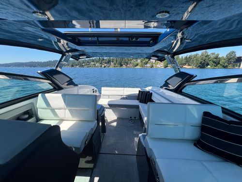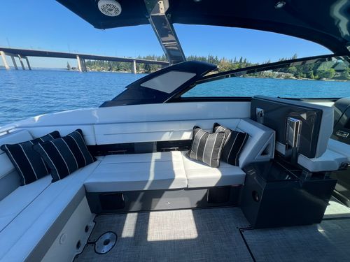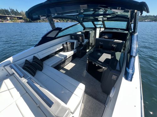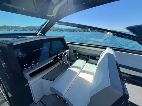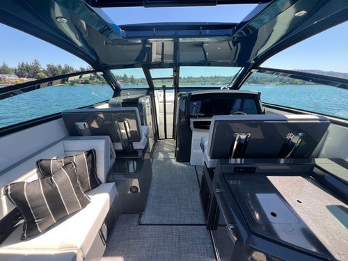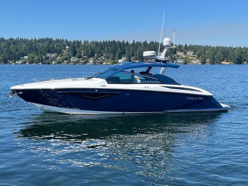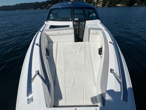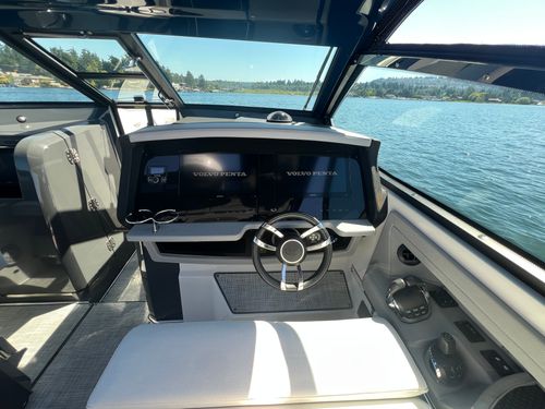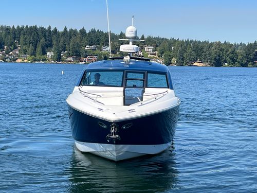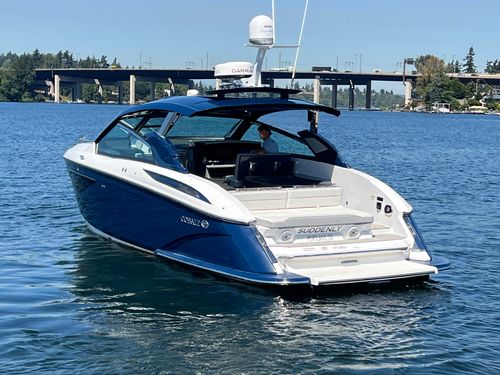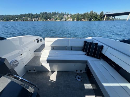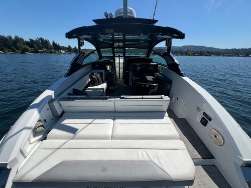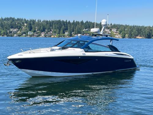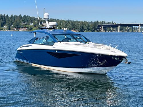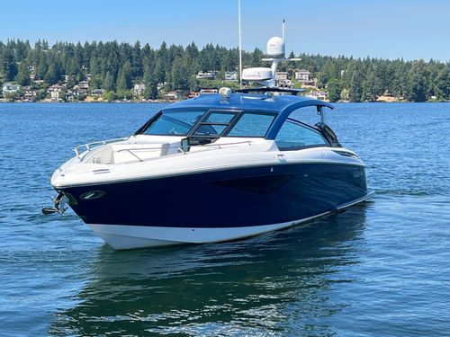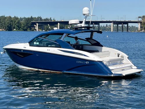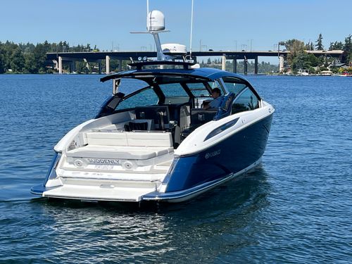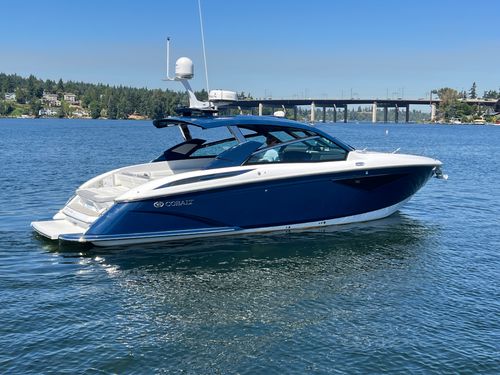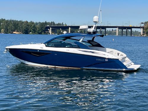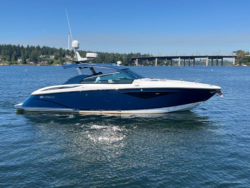 2020 Cobalt A36 w/118 hours ready for summer cruising excursions. A one-owner freshwater boat powered by Twin Volvo Penta V8-380 engines, this Cobalt makes island hopping in the San Juans a breeze, not to mention equipped with the Volvo joystick, taking the stress out of docking in wind and current. Features include dual Garmin touchscreen displays, VHF radio, interior LED lighting, interior speaker system, onboard wet head, hydraulic swim platform w/ ladder, seagrass flooring, shorepower, generator, anchor windlass, auto trim-tabs, lower cabin berth, galley w/ sink and more! Stored in water seasonally with outdoor winter storage. Service records available. Perfect for those seeking comfort and style from used boat dealers. Too many options to list, a must see!