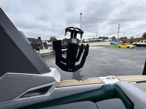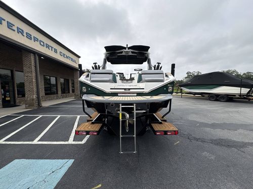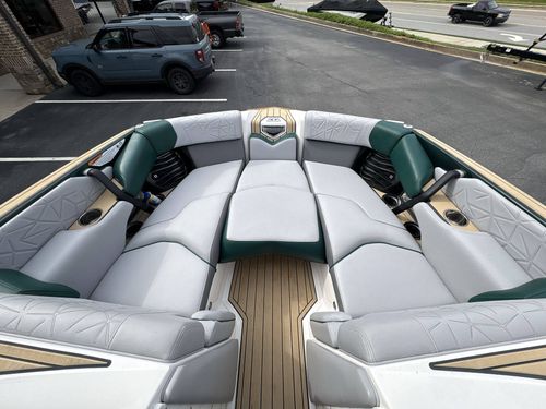 Incorporating a range of colors including Mystic White Interior Deck, Emerald Green Metal Flake Main Stripe, and Hull Rear, Tungsten Grey Hull Bottom, Mystic White FCT, Tungsten Grey FCT Secondary, Tungsten Grey Platform, Haze Grey Interior, Emerald Green Int Main Stripe and Int Accent Piping, Tungsten Grey Seat Boxing and Int Texture, Sahara Sand Non-Skid, and Tungsten Grey Thread Color, this boat truly stands out in aesthetics.