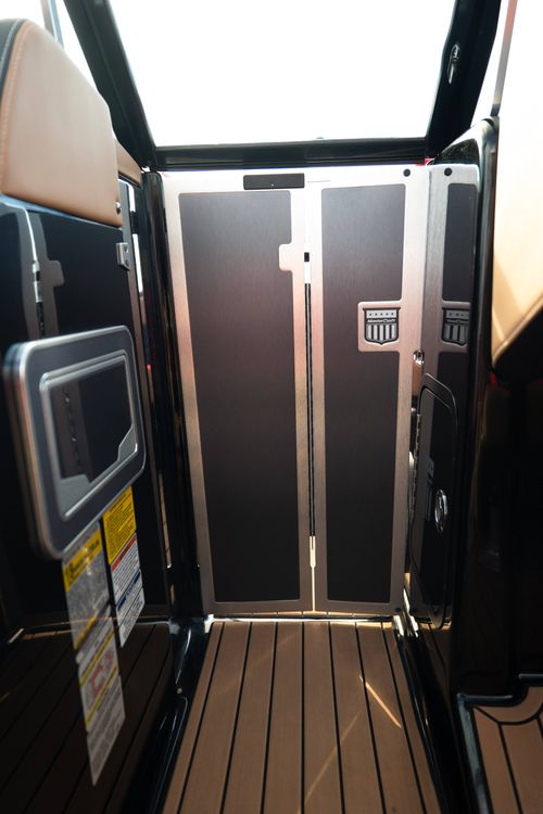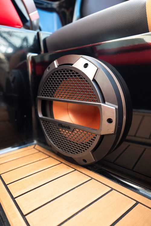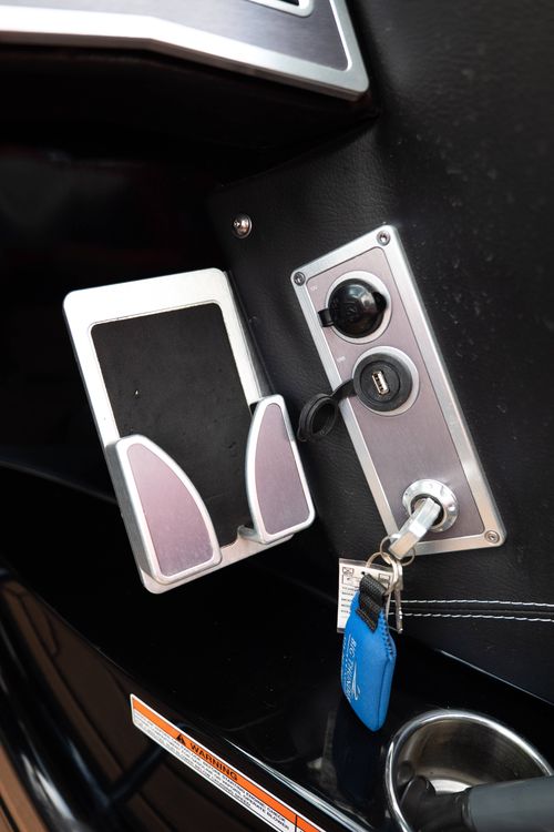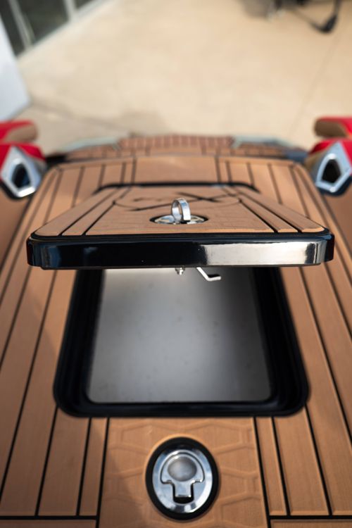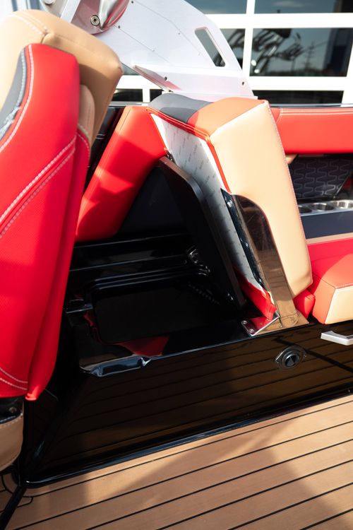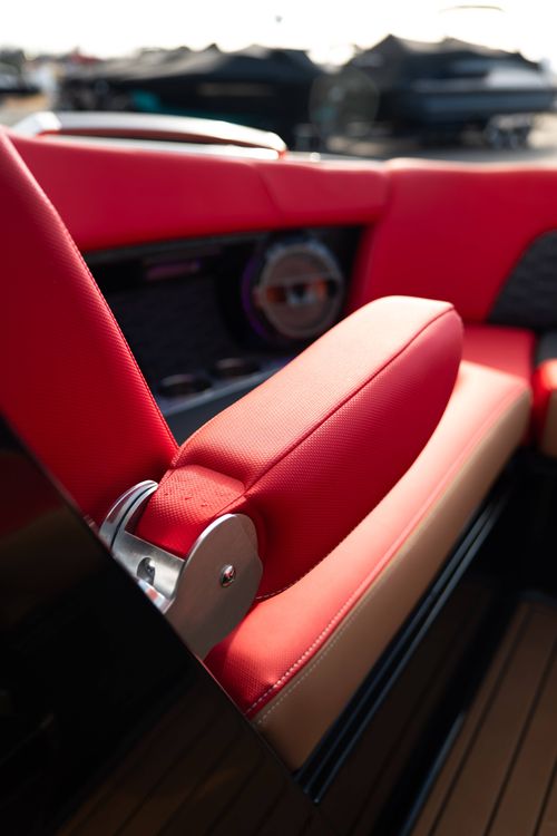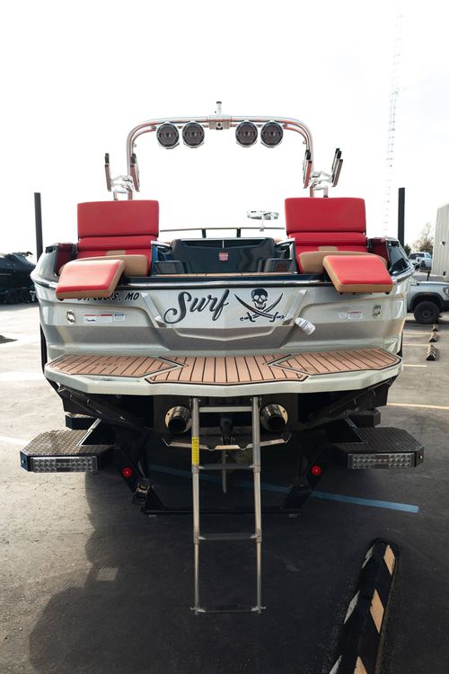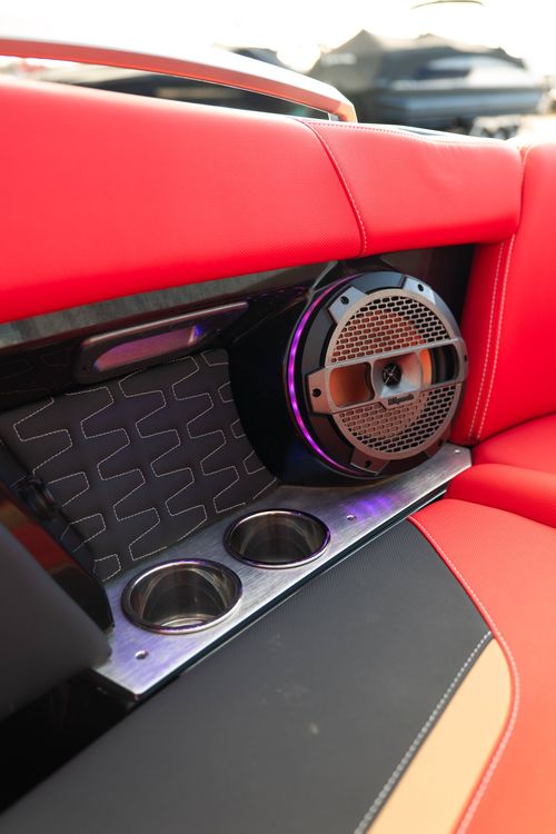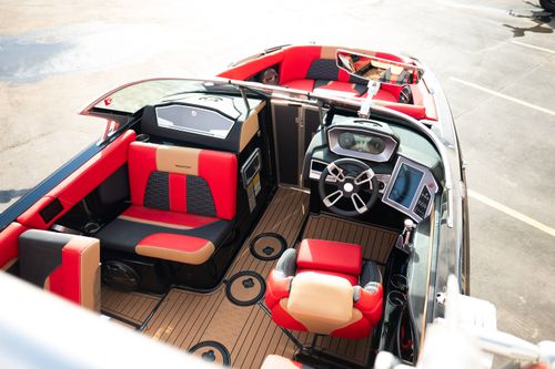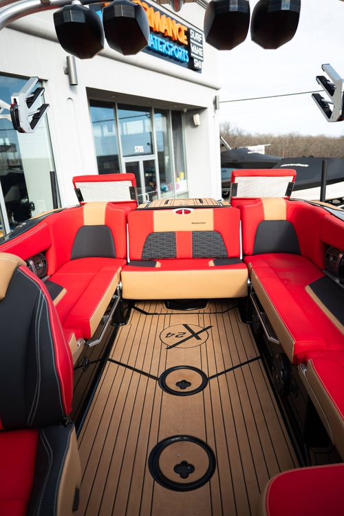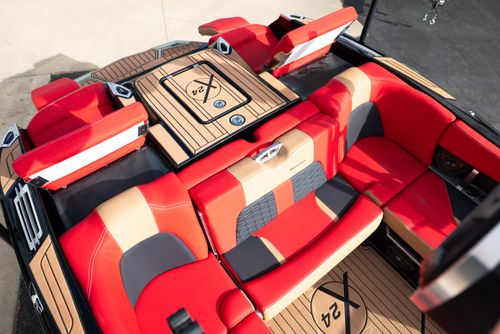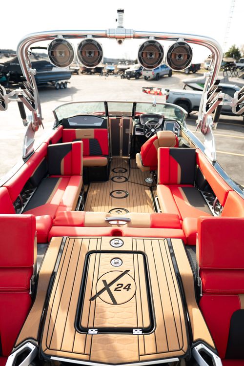 Powered by the Ilmor 6.2L GDI engine, this X24 is equipped with MasterCraft’s Gen 2 Surf System with S2S switching, FastFill ballast system, Dockstar Handling System, ZFT4 tower, Premium Plus dual screen package, stereo observer display, heater, transom lounge seating with footrests, and upgraded tower audio with speaker light rings. The advanced audio package, RGB accent lighting, panoramic mirror, tan SeaDek flooring, and convertible rear seating make this boat an outstanding setup for wakeboarding, surfing, cruising, and relaxing at the cove.