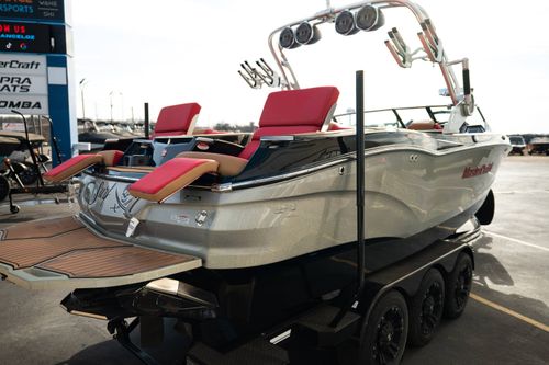 One-owner 2021 MasterCraft X24 with only 100 hours and an excellent list of premium upgrades. Powered by the Ilmor 6.2L GDI, this X24 is equipped with Gen 2 Surf System with S2S switching, FastFill ballast, Dockstar Handling System, ZFT4 tower, Premium Plus dual screens, upgraded tower audio, RGB accent lighting, heater, transom lounge seating, and tan SeaDek flooring. Finished in Midnite Black and Silver Flake with a red, black, and beach tan CoolFeel interior, this X24 delivers flagship-level surf performance, luxury comfort, and standout style.