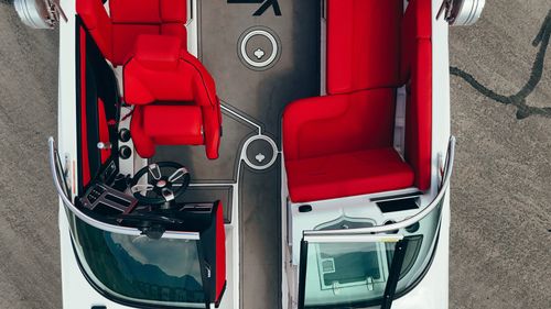 - All-red, premium vinyl seating – immaculate and bold, with room for up to 16 passengers