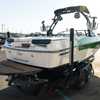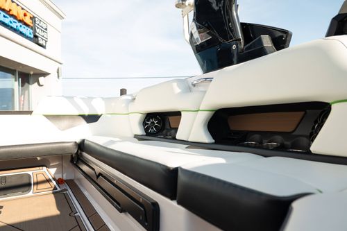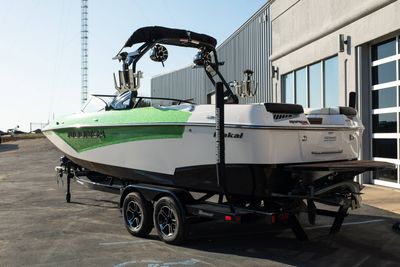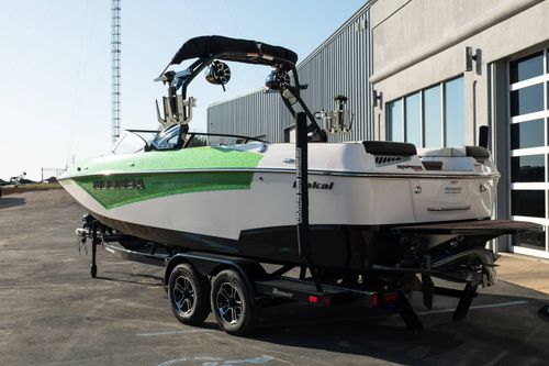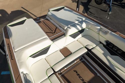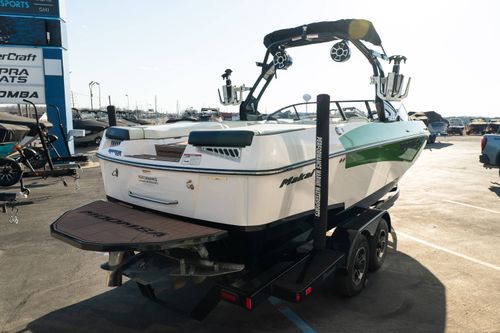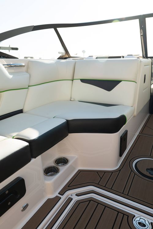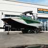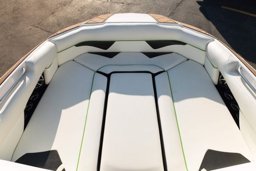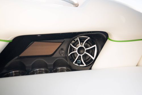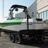Finished in a standout Kiwi Green Metal Flake, White, and Black color combination, this Makai has a bold look and is loaded with desirable options including the Flow 3 Surf System with 6 pumps, Premium Wet Sounds stereo package with bow speakers, subwoofer, and Rev 10 tower speakers, premium PRO tower bimini with folding arms and surf storage, swivel wakeboard rack upgrade, underwater lights, heater, dual battery setup with charger, PTM extended mirror, Zero Off GPS cruise, GatorStep floor and deck kit, walk-thru screen, full boat cover, and swim platform cover. This is a sharp, one-owner Makai with low hours and an excellent setup for wakeboarding, surfing, or cruising.