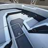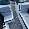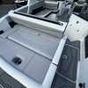 The striking exterior features Pacific Blue with Frost Gray & White accents, highlighted by an extended Frost Gray swim platform & stainless steel docking lights that command attention on and off the water. The aluminum folding arch with integrated Bimini provides effortless shade and a sleek, athletic profile.