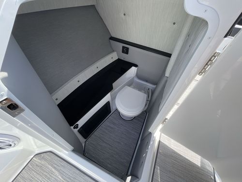 The sport black aluminum windshield and dinette table with teak accent add to the boat's sleek and modern design. The seagrass floor covering and wood interior accent package provide a warm and inviting atmosphere. And when it's time to take a break, the electric porcelain head offers comfort and convenience.