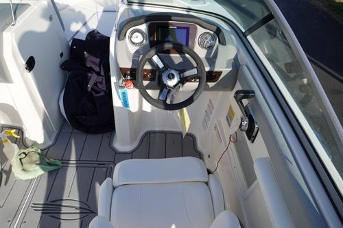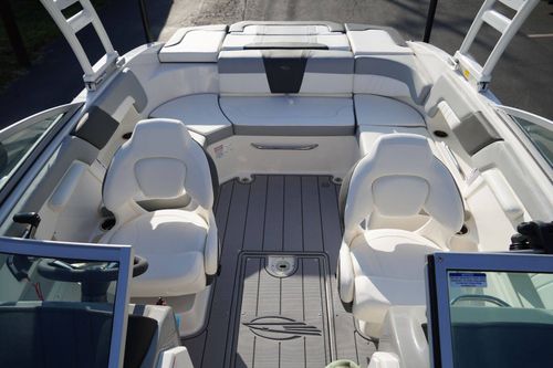 Canvas, Ultra Comfort Pedestal Seat with Flip Up Bolster for Helm & Passenger, Port Console Storage Door and Deluxe Badging,) Simrad GO7 Touch Multifunction Chartplotter, Bowrider Filler Cushion, Cockpit Table with Side Mount Bases, Snap-In Seadek Cockpit Flooring, Seadek Swim Platform Mat, Clarion Stereo System, Dual Battery Setup with Crossover Switch, Docking Lights, Trailer & Cockpit and Bow Cover included. Inquire Today!