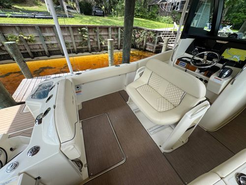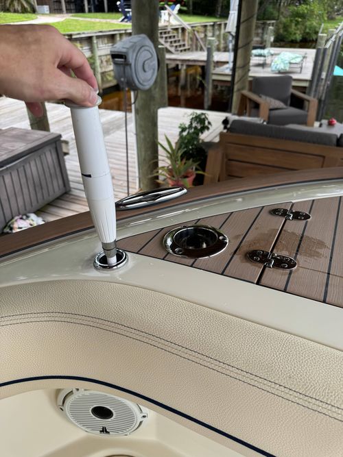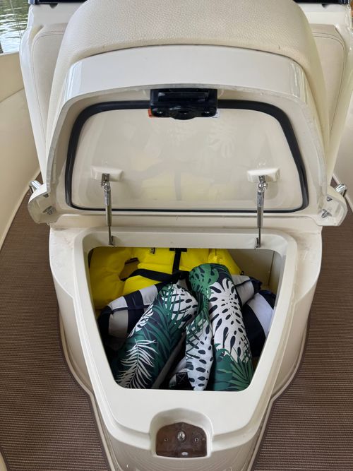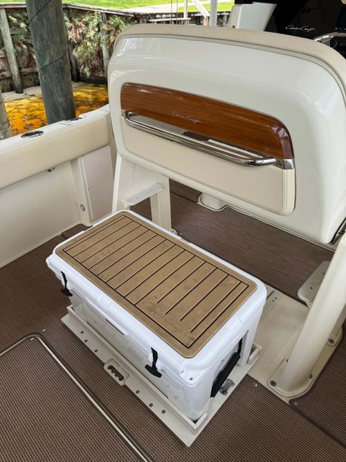 A patent-pending reversible helm seat unique to the Catalina 24. In its forward position, the seat is raised for optimal captain visibility. When converted to face aft, the seat creates a comfortable social zone. Integrated into the helm seat are storage pockets on both starboard and port sides, as well as custom upholstery with accents finished in varnished mahogany and stainless steel. Just below the helm seat, a 65-gallon Yeti cooler slides to accommodate the seat's position.