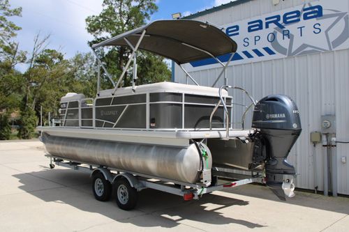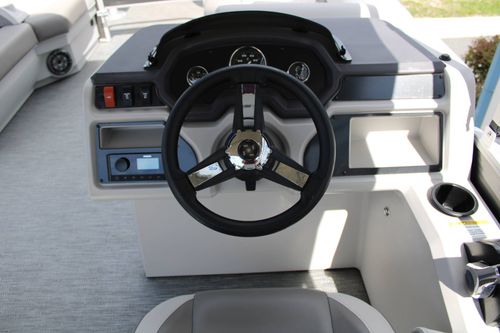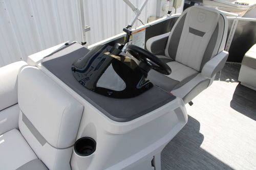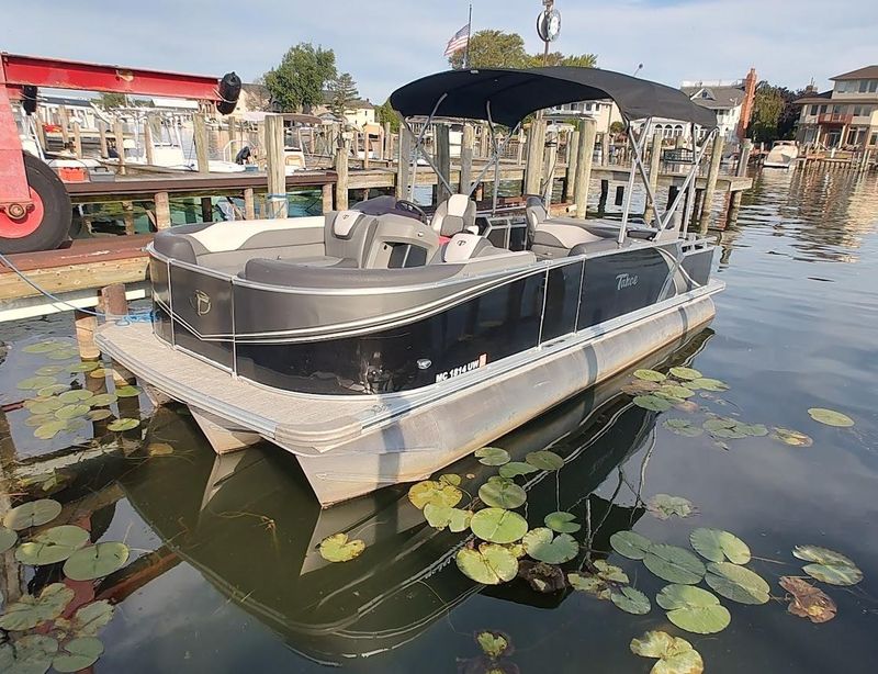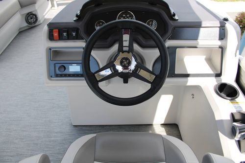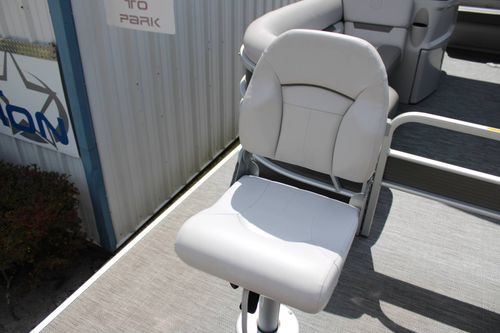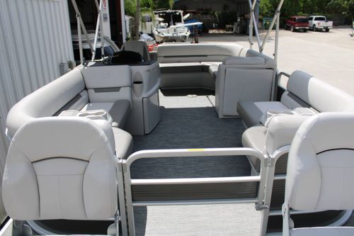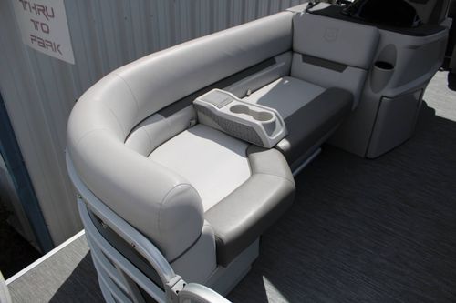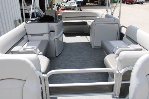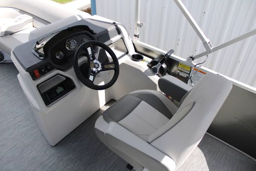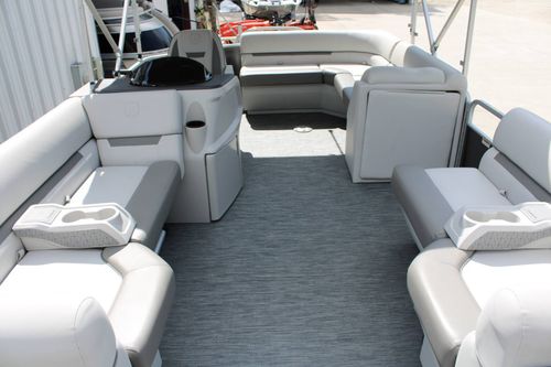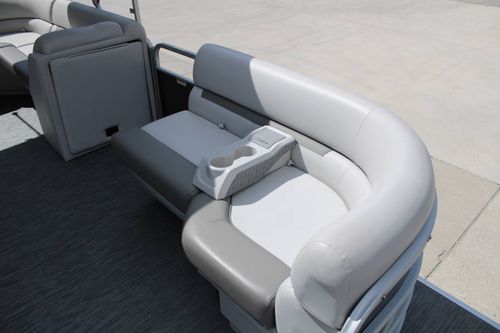 This pontoon is packed with several exciting features like a marine stereo system to serenade your cruise and a built-in cooler to keep beverages chilled while you soak up the sun. Its spacious and modern layout allows for comfortable movement around.