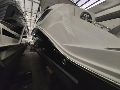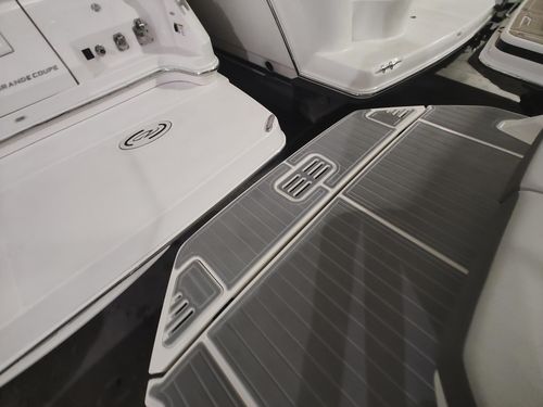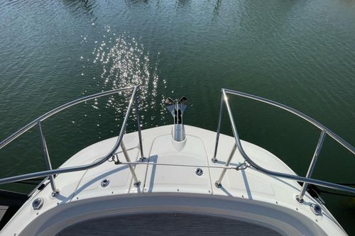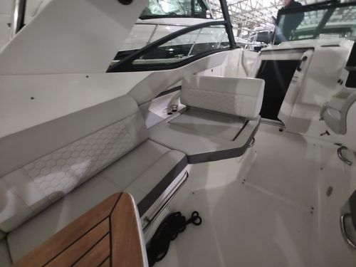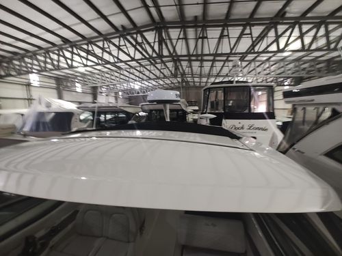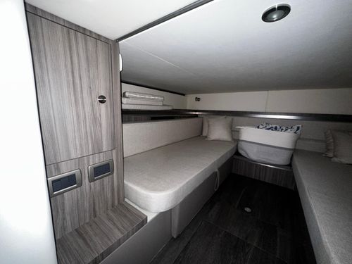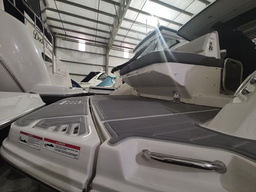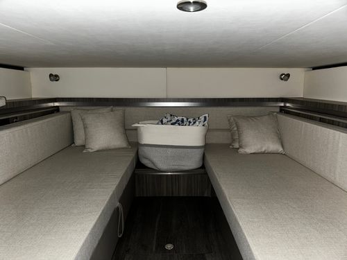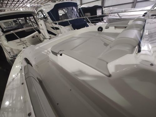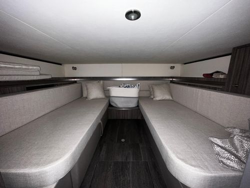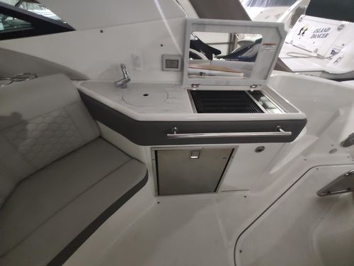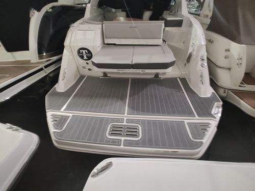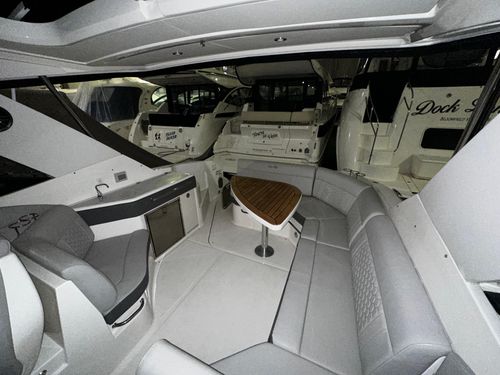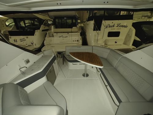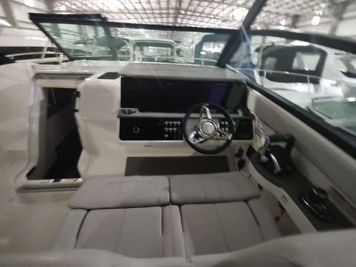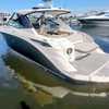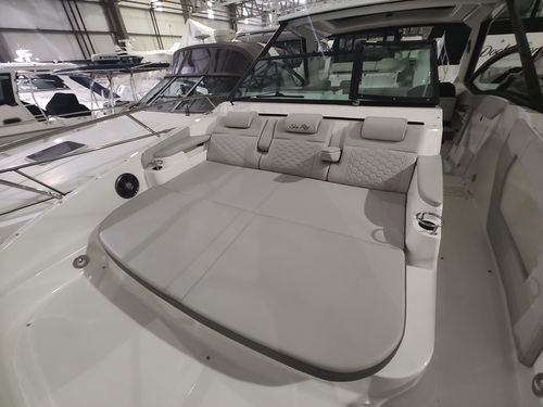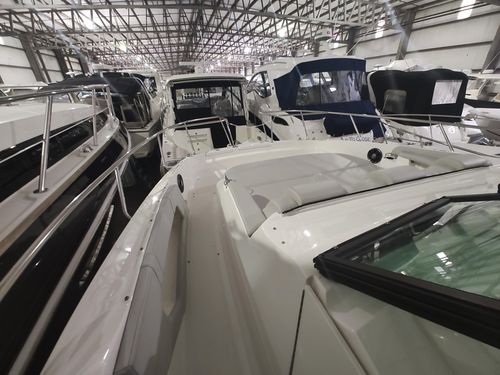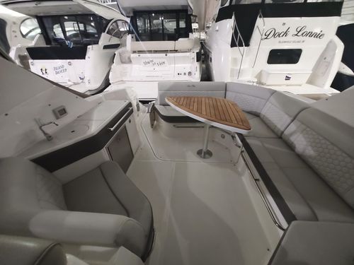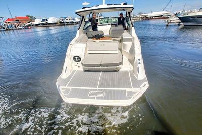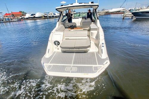 This 2023 Sea Ray 320 Sundancer is available for sale. It has been freshwater-kept by its original owner and is powered by twin MerCruiser 6.2L 300hp engines with Bravo 3 drives and Joystick docking which includes autopilot and Sky Hook!!