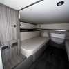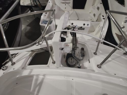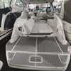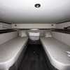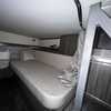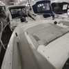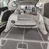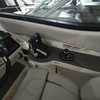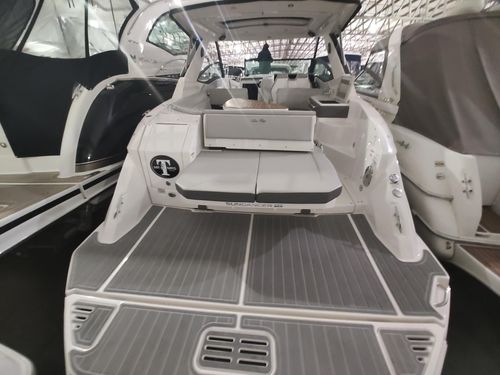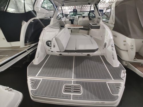 POWERBOAT GUIDE DESCRIPTIONA cross between a sport cruiser and bow rider, the forward lounge seating design of the 320 Sundancer is unique in a boat this size. Accessed from a port walkway with two 6" steps, the bow area features three individual, forward-facing lounge seats, each with an adjustable headrest and fold-down armrests. Cockpit features include a double helm seat with flip-up bolsters, an L-shaped settee with a removable table to port, a single jump seat abaft the helm, and a molded entertainment center aft of the jump seat with a Corian countertop, sink, refrigerator, trash receptacle and optional electric grill. Stowage is in the cockpit side panels, beneath the seats and in a deep transom compartment. A sun shade deploys from the hardtop to extend over the entire cockpit. Below, the 320 has a well-appointed cabin with an enclosed head and sleeping accommodations for four. In the aft cabin, sliding twin beds combine to form a queen bed, and the forward dinette converts to a V-berth. The mini-galley at the foot of the companionway steps includes a microwave and refrigerator. Twin 300hp MerCruiser Bravo III sterndrives cruise the 320 Sundancer at 24–26 knots (high 30s top).