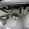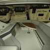 The boat features a spacious cockpit with seating, a wet bar, and a sunpad. Below deck, the cabin includes a galley, head, and sleeping accommodations. Notable features include a generator, air conditioning, an extended swim platform, and Simrad electronics.