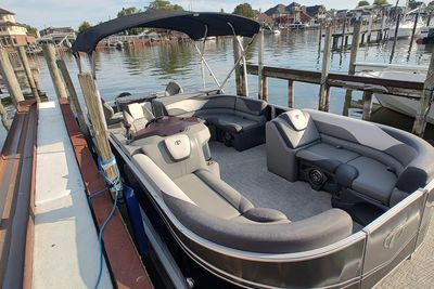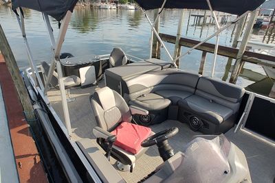 The 2023 Tahoe LTZ Rear Fish 22' is a smartly configured pontoon that blends family cruising comfort with serious fishing functionality. At just over 22 feet, it features a classic cruise bow layout with wraparound benches, while the stern is dedicated to angling—complete with two swivel fishing chairs, a livewell, rod holders, and a rear bait station2. The helm is outfitted with a Garmin touchscreen and Fusion Bluetooth stereo, and the woven vinyl flooring adds durability with a clean finish. With a 150 HP Mercury outboard and sport lifting strakes, it’s more than capable of handling inland lakes and river runs with ease while also providing plenty of comfort for all passengers aboard.