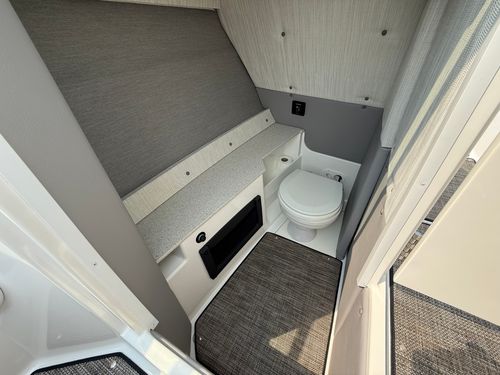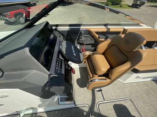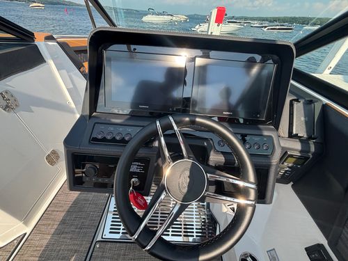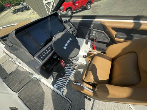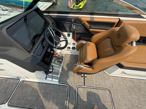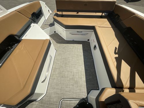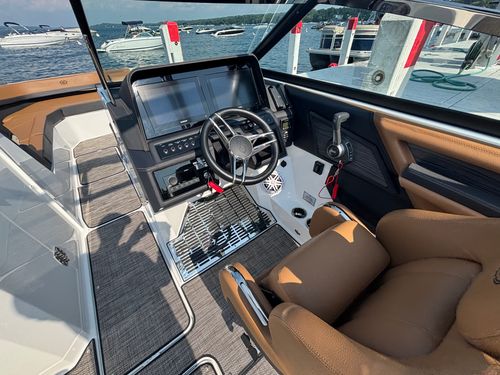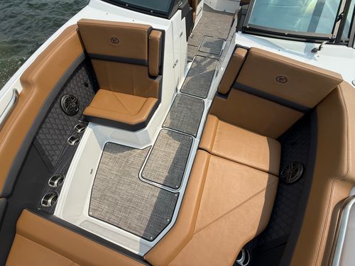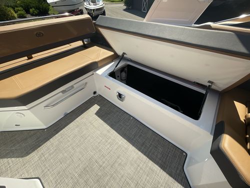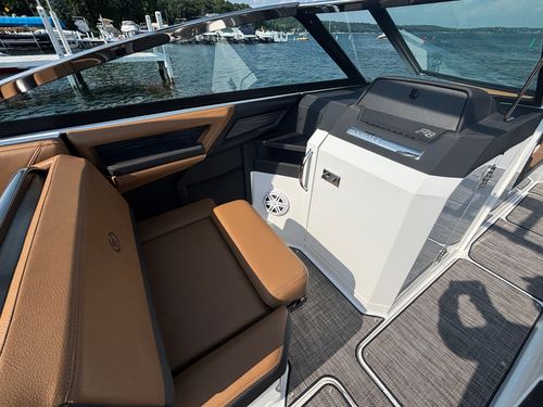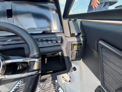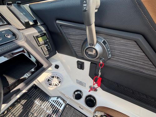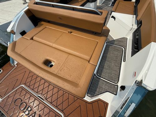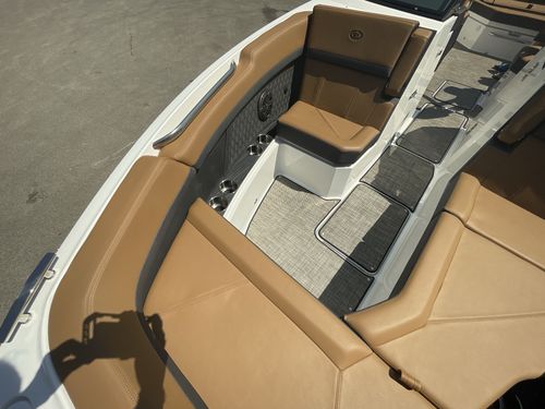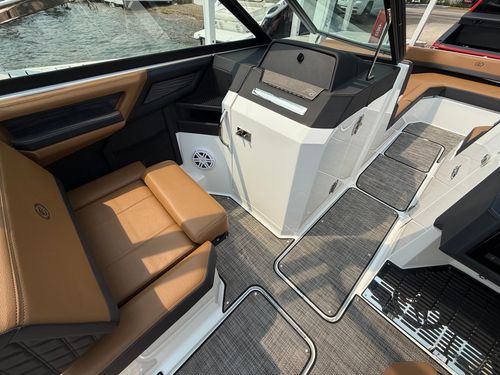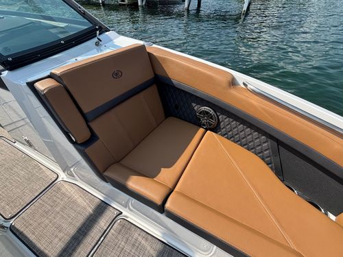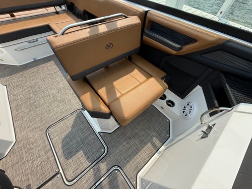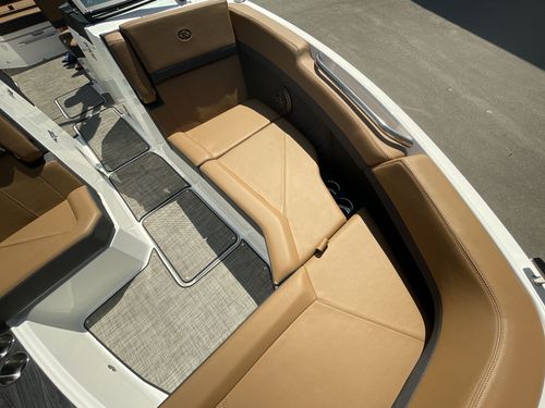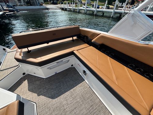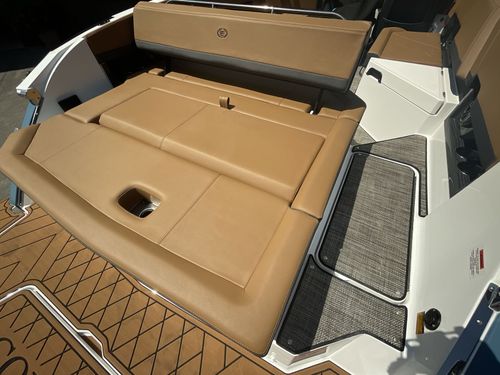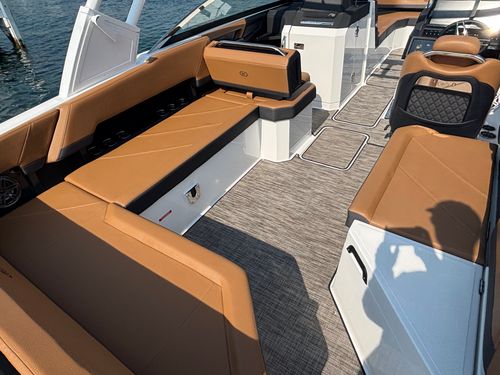 The folding arch in pristine white, coupled with the ebony bimini, sets the stage for your aquatic escapades. Lounge in comfort on the Caramel & Carbon interior seating, surrounded by the sea grass flooring that adds a touch of opulence to every step. The soft-trac mats on the swim platform provide a secure footing, whether you're enjoying water activities or simply soaking up the sun.