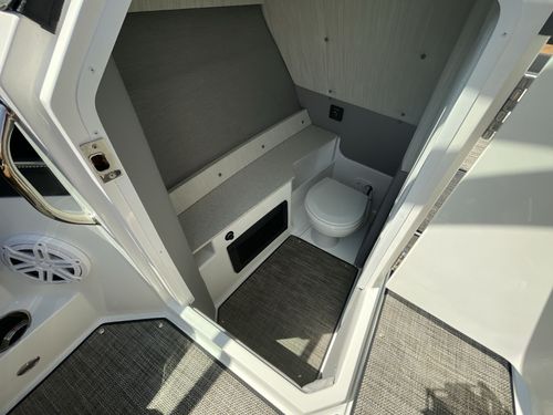 The solid teak dinette table invites you to indulge in culinary delights while surrounded by the breathtaking views of open waters. Stainless steel docking lights not only enhance safety during nighttime maneuvers but also accentuate the Cobalt R8's timeless elegance. The electric porcelain head ensures convenience and comfort for all aboard, while the wireless phone charger/holder keeps you connected without interruption.