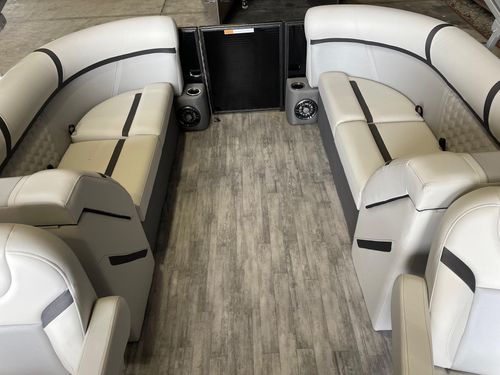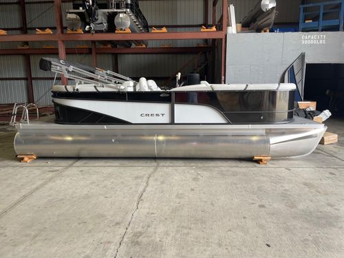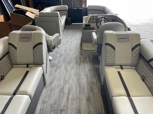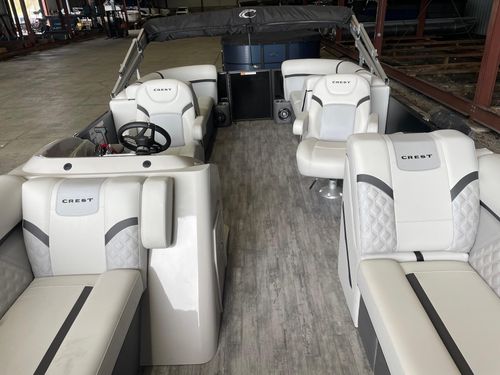 The Crest Marine 220 SLC Classic DLX pontoon boat is a luxurious and versatile vessel designed for both relaxation and adventure on the water. This model boasts a spacious layout with plush, ergonomic seating for up to 11 passengers, making it perfect for family outings and social gatherings. It features advanced marine technology, including a raised helm platform for enhanced visibility and control, and a premium Fusion Bluetooth audio system with LED lighting for an immersive entertainment experience. With its robust performance package, including 25” diameter tubes and higher horsepower capacity, the 220 SLC Classic DLX ensures a smooth and powerful ride.