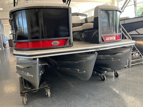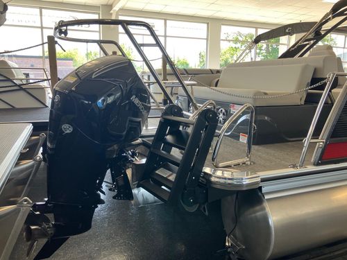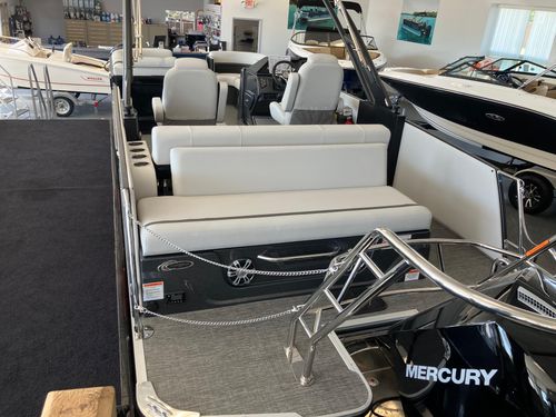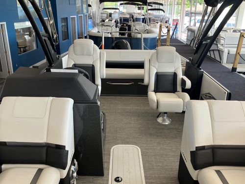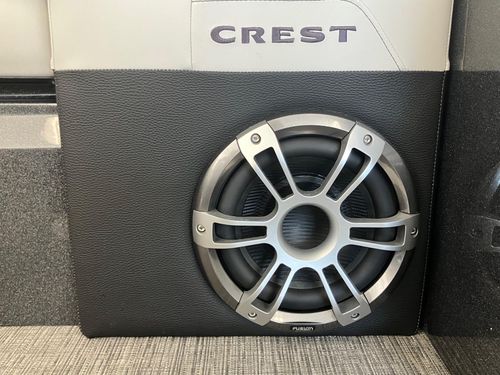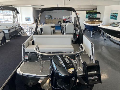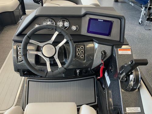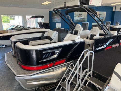 The Crest Marine 230 Caribbean SLS RS is a pontoon vessel that combines entertainment features with agile handling. Its powder-coated perimeter fencing features a dramatic flare aft, complemented by an optional clad tower overhead. The molded accent on the fence lights up, as do the interior speakers in various shades. The helm showcases a billet aluminum dash with aircraft-style lighted toggles. Passengers can stretch out on the 7-foot parallel lounges, and the seat bases are sleek, molded fiberglass. The 250 SLS model features Crest’s CP3 Performance Package, including twin 25-inch outer tubes around a central 26-inch tube pontoon dropped 1 inch to create a V-hull effect.