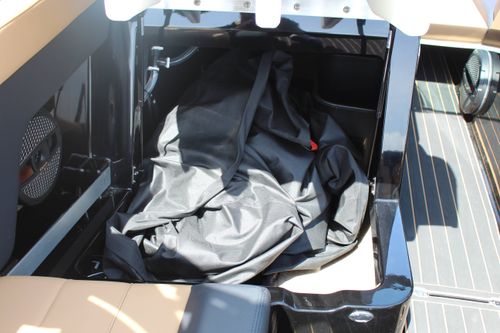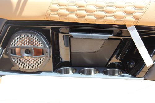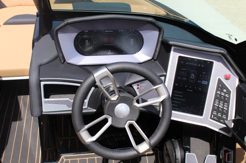 Condition: Like New – With only 10.7 engine hours, this boat is in pristine condition, featuring the striking Ashley Kidd Signature Edition “Golden Hour” metal flake exterior with bold red, white, and black accents, designed for world-champion wake surfing.