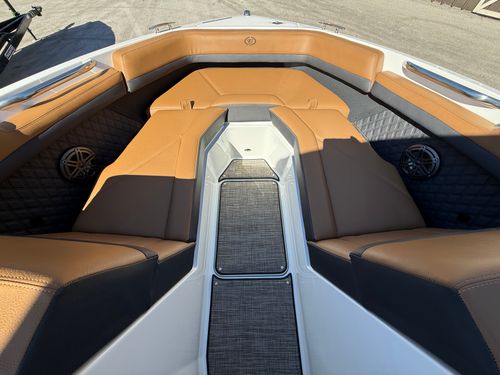 Dressed in a bold Knockout Red and Navy exterior with a custom three-color graphic and swim platform accent, this boat is designed to make a statement. Inside, the Caramel/Carbon interior with the wood interior accent package adds warmth and elegance, while the Sea Grass floor covering ensures premium comfort underfoot.
