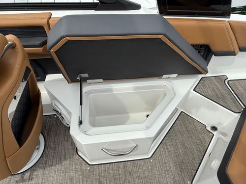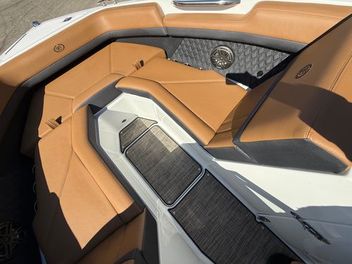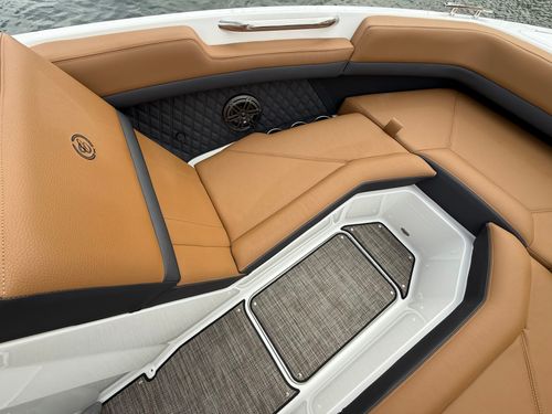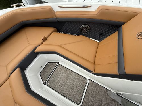 Sleek & Stylish Exterior: A striking Rich Ebony hull with Graphite Gray accents and a custom three-color design with swim platform accent ensures this boat turns heads on the water.