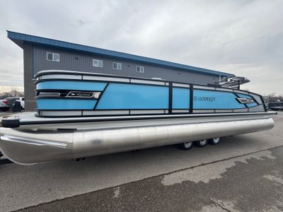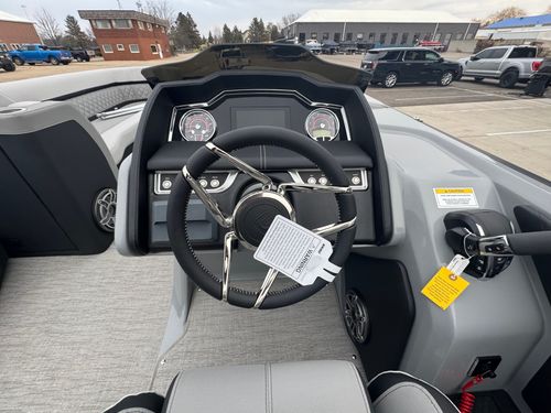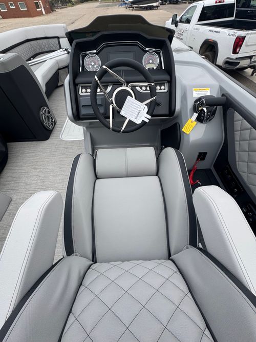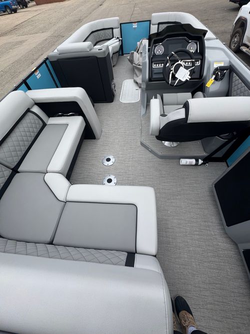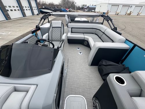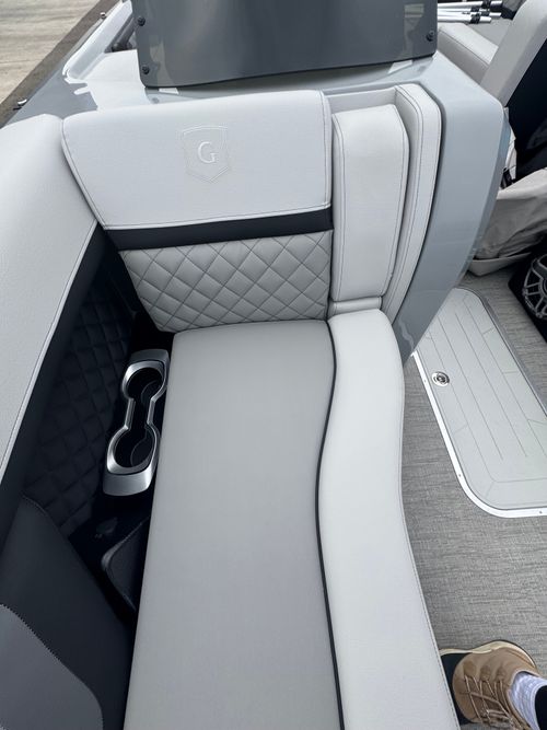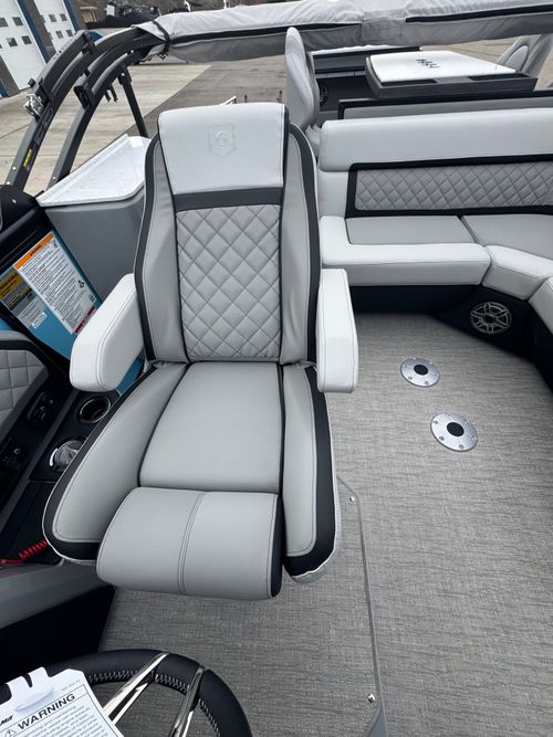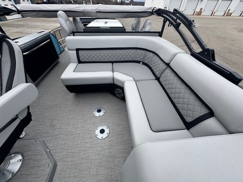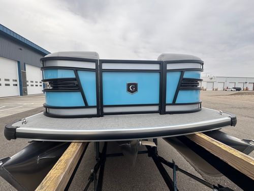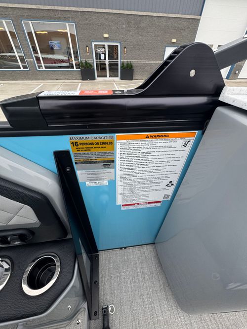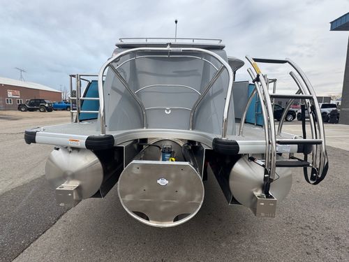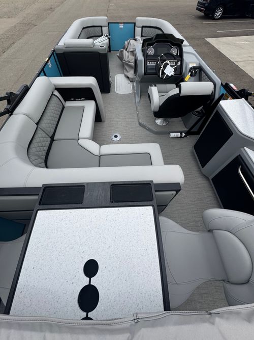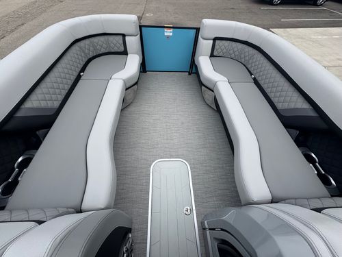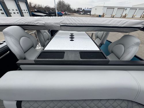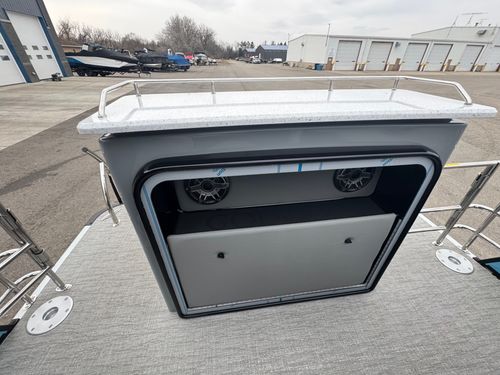 - Stern Entertainment Bar: Fiberglass engine shroud, raised solid surface area with stainless steel accents, SS safety barrier, SS gates, accent lighting