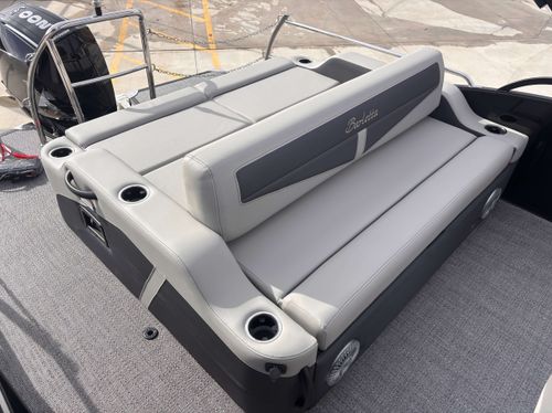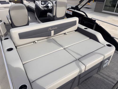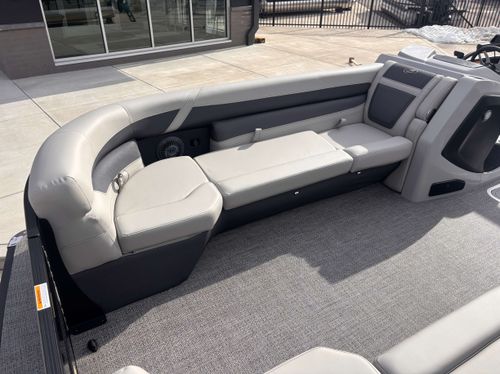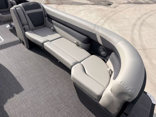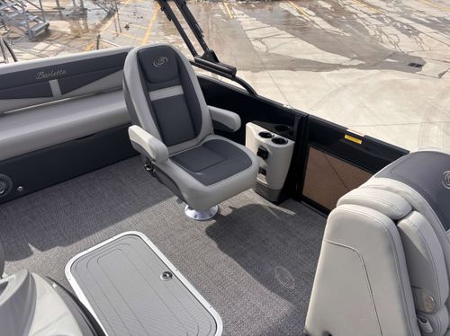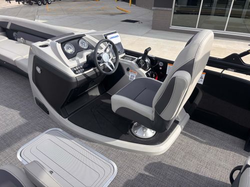 •High back Reclining Helm Seat with Swivel and Slide•Wireless Charging Station•25” Diameter Tubes•Integrated Pet Food/Water Dishes,•Raised Helm Platform w/Marine Mat•Lowrance Hook 5•V.I.P. Technology (Vibration Isolation Pad)•Bow & Port Gate with Doggie-Dock View•Power Bimini Top w/ Boot,•Snapless Playpen Cover