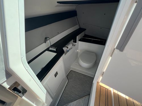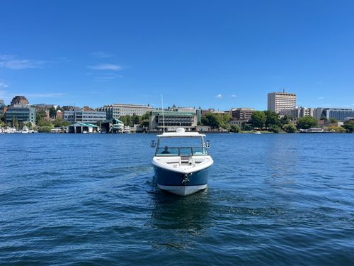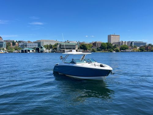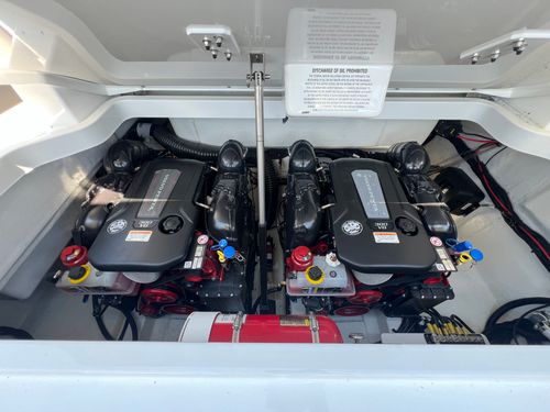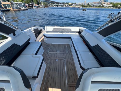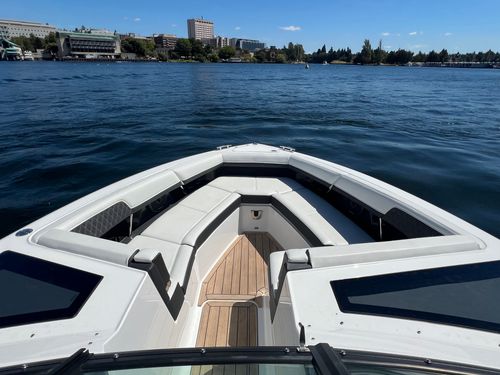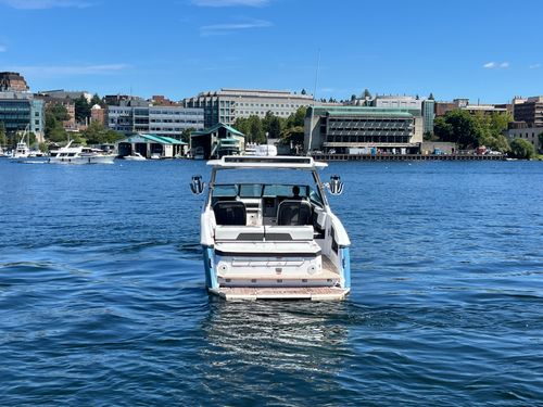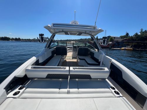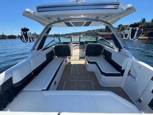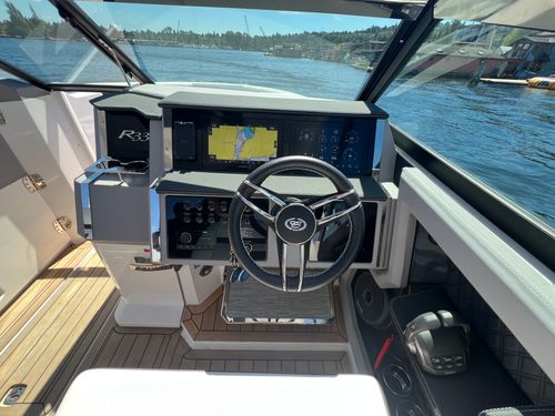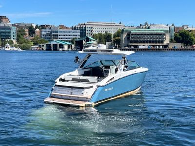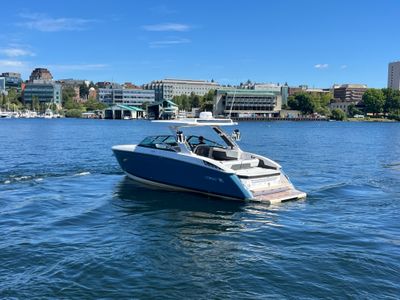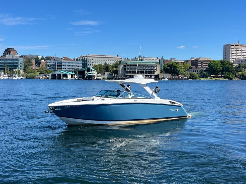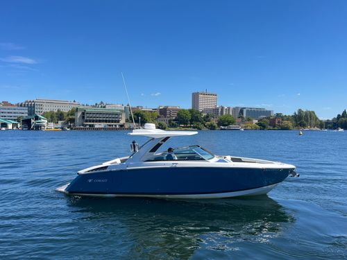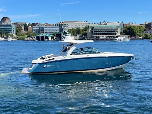 Recent Price Drop! WAS $549,900, NOW $519,900! 2025 Cobalt R33 Surf with only 70 hours on the twin Volvo V8 380's w/ joystick! One-owner freshwater only R33 Surf stored indoors in the offseason. Boat is loaded with options, including full teak flooring, extendable sun awning, platinum Harmon Kardon audio, splash n' stow, side boarding door, dual board racks, vacuflush head, and more!