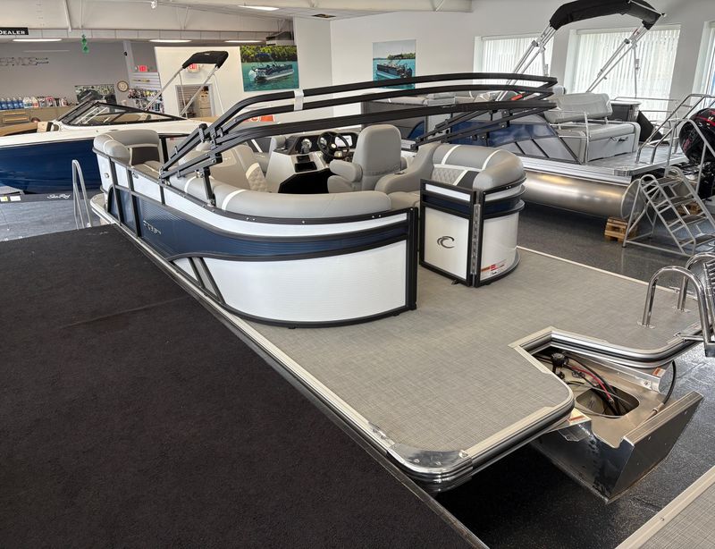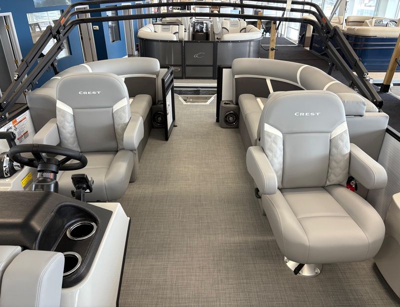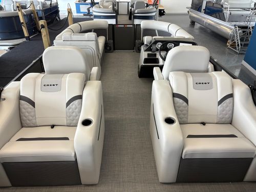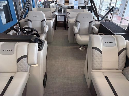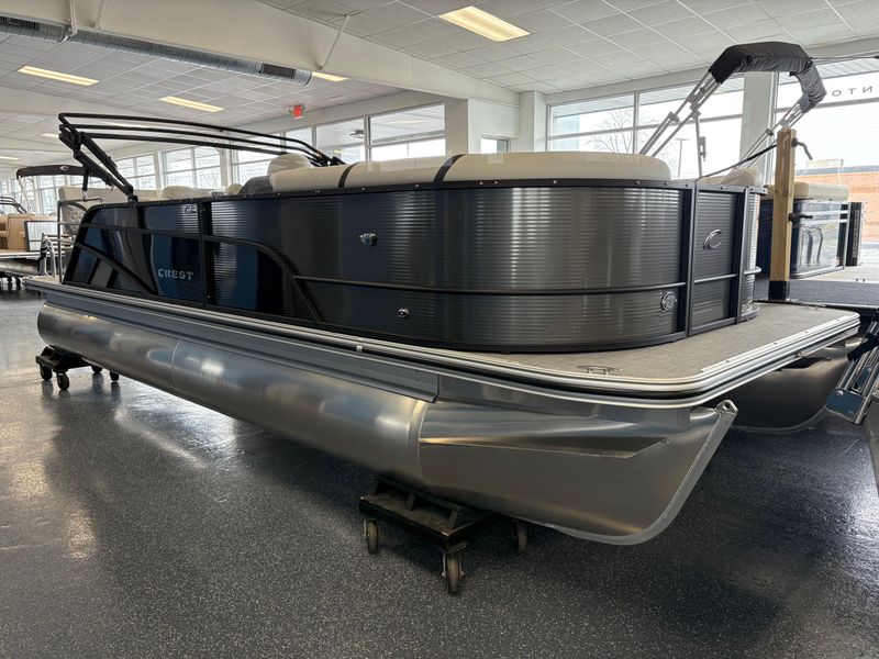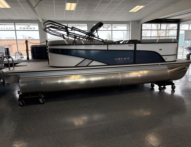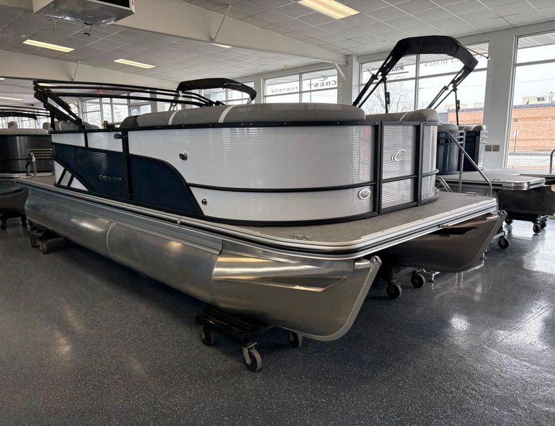 The 2025 Crest 220 SLRC Classic LX is a versatile pontoon boat designed for relaxation and adventure on the water. With a length of 22 feet, it offers ample space for passengers and features a rear chaise lounge for comfort. Its thoughtful design includes a powder-coated bimini top and a well laid out helm station with advanced marine technology to ensure safety, control, and convenience.