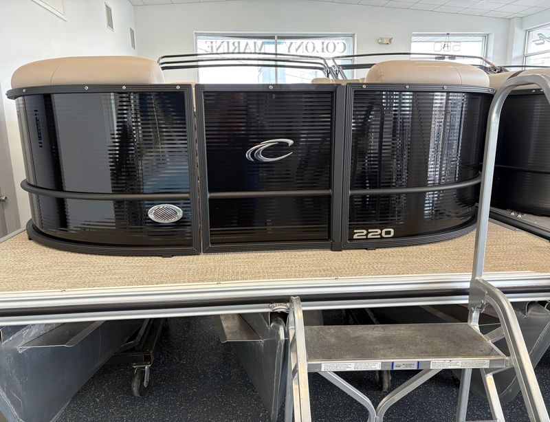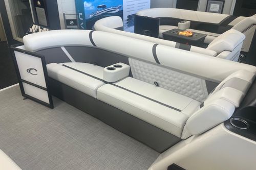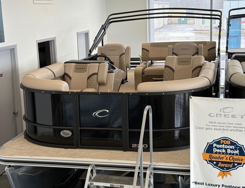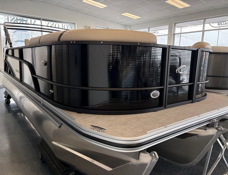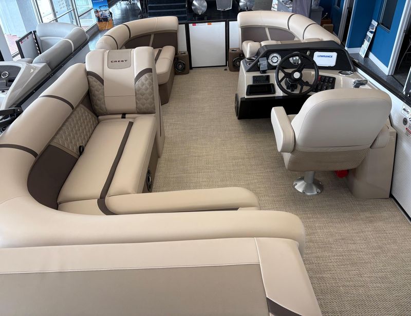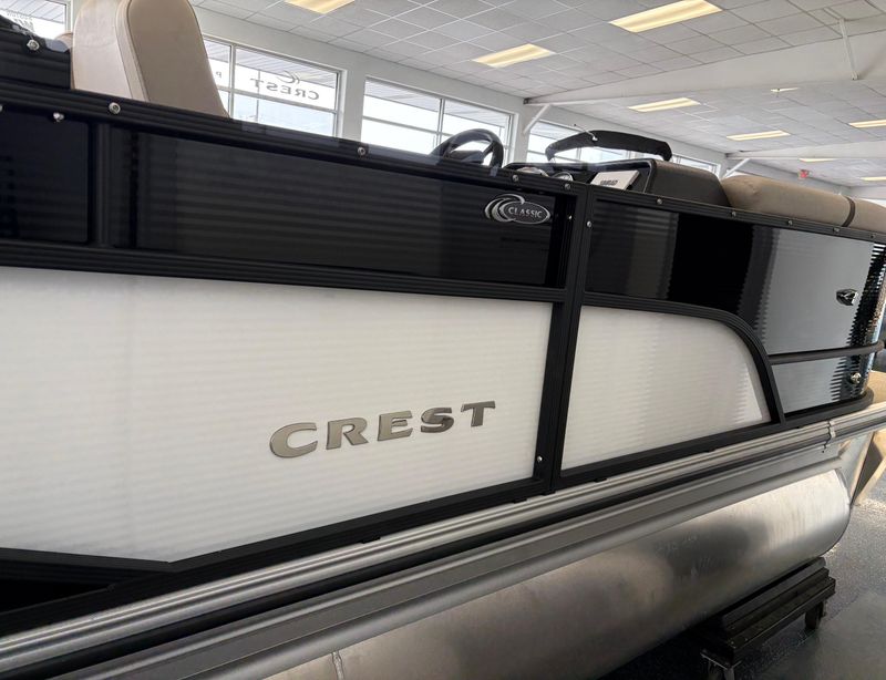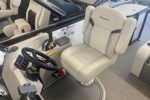 The Crest 240 SLSC Classic LX is a 24-foot pontoon that blends sporty design with versatile comfort, ideal for both laid-back cruising and active days on the water. Its signature swing-back lounge and dual captain’s chairs offer flexible seating, while the raised helmstand and midship entertainment table enhance usability and flow. Built with oversized aluminum pontoons and premium vinyl flooring, it delivers stability and style. Features include a Lillipad ladder, removable oval table, and 5" Eagle Lowrance GPS touchscreen display, all wrapped in Crest’s sleek, modern aesthetic.