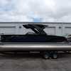 Presenting the 2025 Godfrey SanPan 2700 Dual Flip Lounge decked out with a full windshield to provide a buffer against wind and water spray while cruising. The perfect companion for your boating adventures, this luxury pontoon offers stunning design and innovative features.