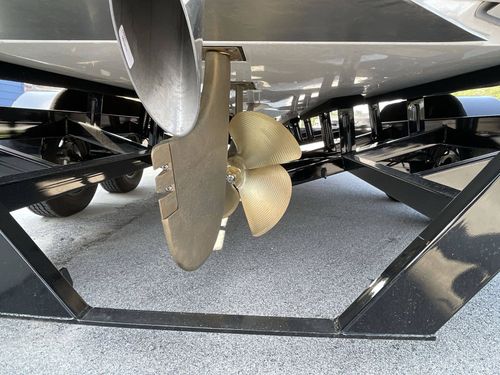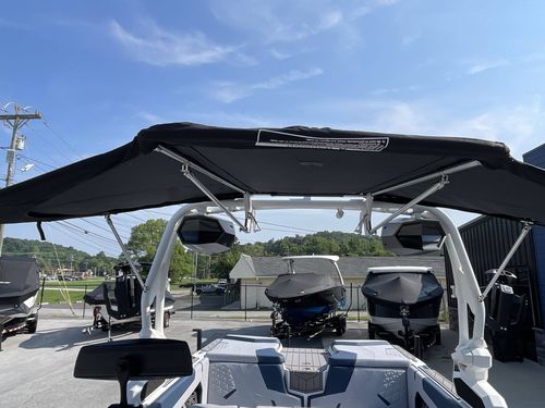 This boat boasts several tower accessories, including Bimini - Tower Mounted Tri-Fold with Surf Pockets, a Nautique Awareness Camera for ultimate safety, Nautique Strapless Board Racks for convenient storage, a Tower Prep Kit JL Audio M Series Elite (Pre-Wired 4 Channel Amp) and Tower Speakers which include a single speaker housing JL Audio M6 Series 880x Speakers, all equipped with a 2500N Tower Shock for ultimate stability.