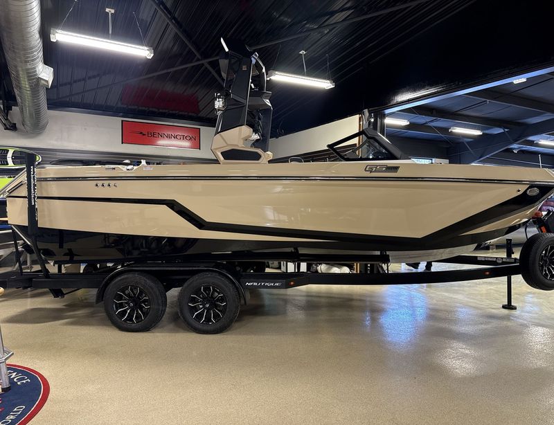 Amenities include a tower-mounted, Bi-Fold Bimini with surf pockets, Nautique Strapless Board Racks, and a Tower Prep Kit JL Audio M Series Elite pre-wired for a 4-channel Amp. The tower accessories enhance convenience and boost the water sporting experience.