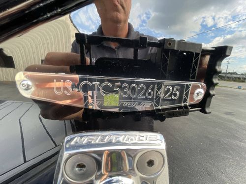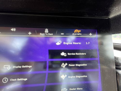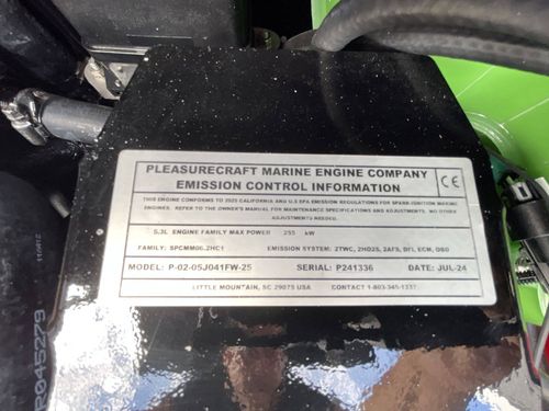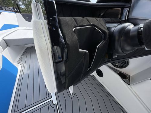 Other features include a supplemental Ballast with an additional 500 lbs, a Heater with defroster for comfort in cooler weather, Docking and Daytime running lights for enhanced visibility, underwater lights, and a LINC Panoray equipped with Navionics Maps. It also offers wireless charging capability and a tandem spoke leather steering wheel.