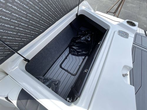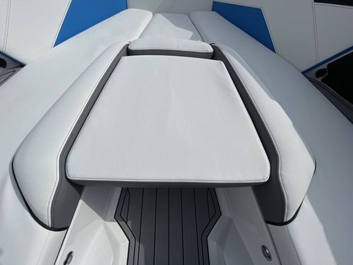 The interior decor employs a Mystic White primary color, Masters Blue for the main stripe, and Jet Black accent piping. The seat boxing color is Tungsten Grey and an added bonus, a Jet Black decorative stitch panel. For the ultimate finishing touch, the non-skid color is Titanium Grey, the thread color is black, and Chromax badging in Black Chrome Finish with Illusion rounds off the exquisite interior.