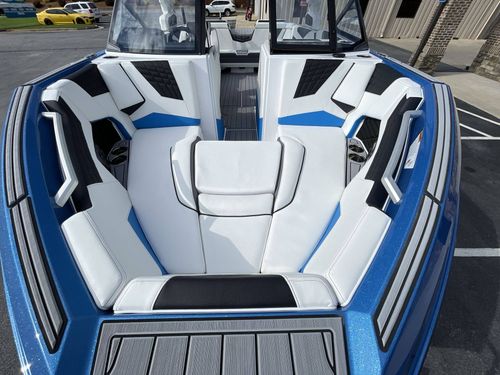 The Super Air Nautique S23 boasts a visually striking color scheme with Mystic White interior deck color, Masters Blue metallic flake main stripe, Jet Black accents, and a bright chrome finish with Illusion Frost.